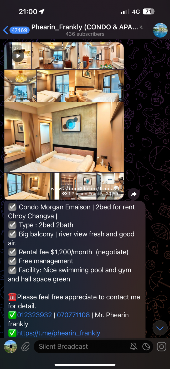 ☑️ Condo Morgan Emaison | 2bed for rent Chroy Changva | ☑️ Type : 2bed 2bath ☑️ Big balcony | river view fresh and good air. ☑️ Rental fee $1,200/month (negotiate) ☑️ Free management ☑️ Facility: Nice swimming pool and gym and hall space green Please feel free appreciate to contact me for detail. ✅012323xxxClick To Call | 070771xxxClick To Call | Mr. Phearin frankly ✅https://t.me/Phearin_Frankly01 ➡️Check other room channel ✅ https://t.me/apartmentcondorental ✅012755xxxClick To Call | 010778xxxClick To Call | Ms. Meyly ✅https://t.me/meylycondo ➡️Check other room channel ✅https://t.me/mey_ly99999 Thanks with respectfully.