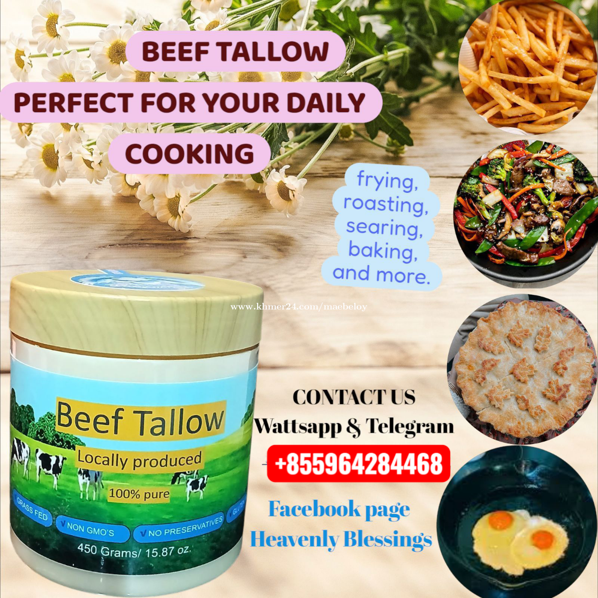Tallow can be used in countless ways .It is an excellent fat for cooking at high temperatures, because it has a high smoke point. great option for baking, especially in savory pastries and pies, as it adds a rich, earthy flavor and can create a flaky texture due to its high smoke point, making it a good substitute for butter or shortening in many recipes. And it can be good for skincare, especially for people with very dry skin, as it's rich in fatty acids that closely mimic the skin's natural oils, acting as a deep moisturizer and potentially helping to repair the skin barriers now available in supermarkets. ANGKOR SUPERMARKET ROAD6 https://maps.app.goo.gl/dBEeoFRgvPcDbkpr9 ANGKOR SUPERMARKET PREAH SIHANOUK AVE. https://maps.app.goo.gl/GmJRR2mTRrpZLPS36 CHAO SANGHOK SUPERMARKETS https://maps.app.goo.gl/S9jBwtwzQbbahFBf8 https://maps.app.goo.gl/CBRyoCzggdPvGQzd9 Don't wanna leave the comfort of home? Forget about it! , we got you covered. You can still order factory direct for $9.00 + shipping we deliver through GRAB if your in SiemReap.J&T EXPRESS, VIRAK BUNTHAM for orders outside SIEM REAP.