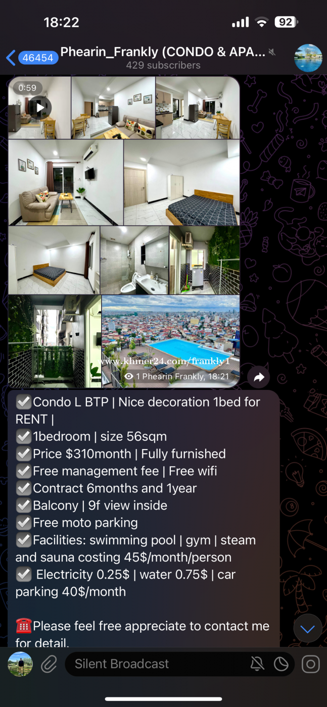 ☑️Condo L BTP | Nice decoration 1bed for RENT | ☑️1bedroom | size 56sqm ☑️Price $310month | Fully furnished ☑️Free management fee | Free wifi ☑️Contract 6months and 1year ☑️Balcony | 9f view inside ☑️Free moto parking ☑️Facilities: swimming pool | gym | steam and sauna costing 45$/month/person ☑️ Electricity 0.25$ | water 0.75$ | car parking 40$/month Please feel free appreciate to contact me for detail. ✅012323xxxClick To Call | 070771xxxClick To Call | Mr. Phearin frankly ✅https://t.me/Phearin_Frankly01 ➡️Check other room channel ✅ https://t.me/apartmentcondorental ✅012755xxxClick To Call | 010778xxxClick To Call | Ms. Meyly ✅https://t.me/meylycondo ➡️Check other room channel ✅https://t.me/mey_ly99999 Thanks with respectfully.