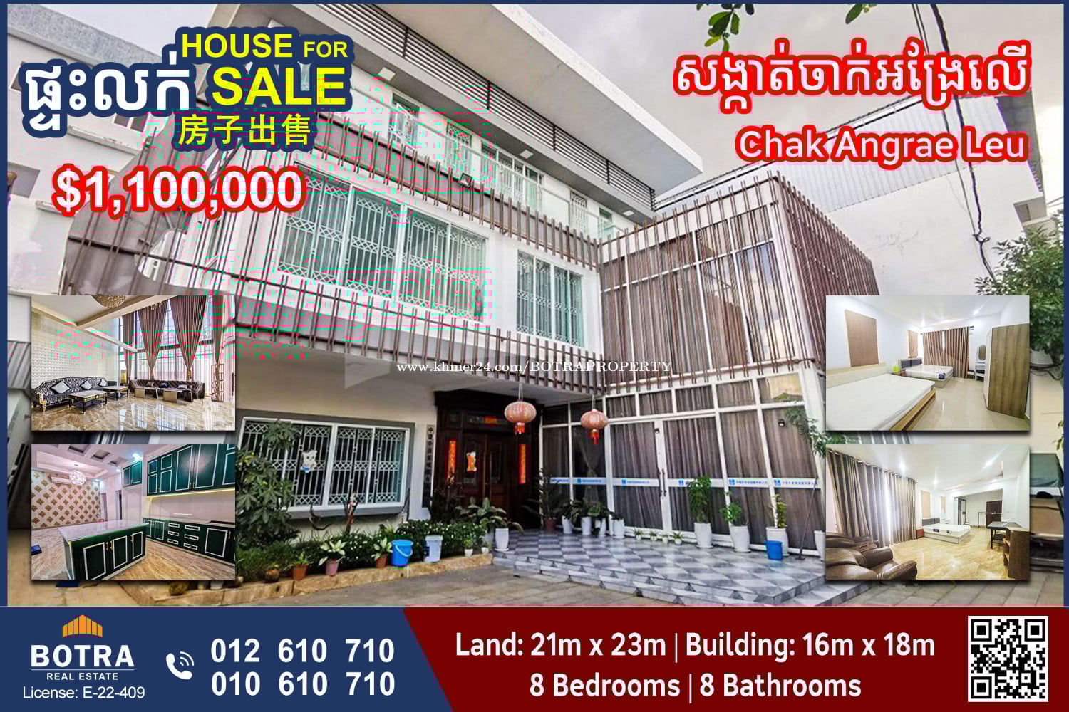 ๐ก Big Villa for Sale ๐ Locate in Chak Angrae Leu - Land size : 21m x 23m - Building size : 16m x 18m - Total : 490sqm (hard title) - 1 Master Room+WC (Floor L0) - 2 Master Room+WC (Floor L1) - 4 Bedroom+WC (Floor L2) - 1 Sauna Room - Sale Price : $1,100,000 โโโโโโโโโ Contact us now ๐ 012610xxxClick To Call (Cellcard) ๐ 010610xxxClick To Call (Smart) โถ๏ธ t.me/BotraRealEstate (Chat)