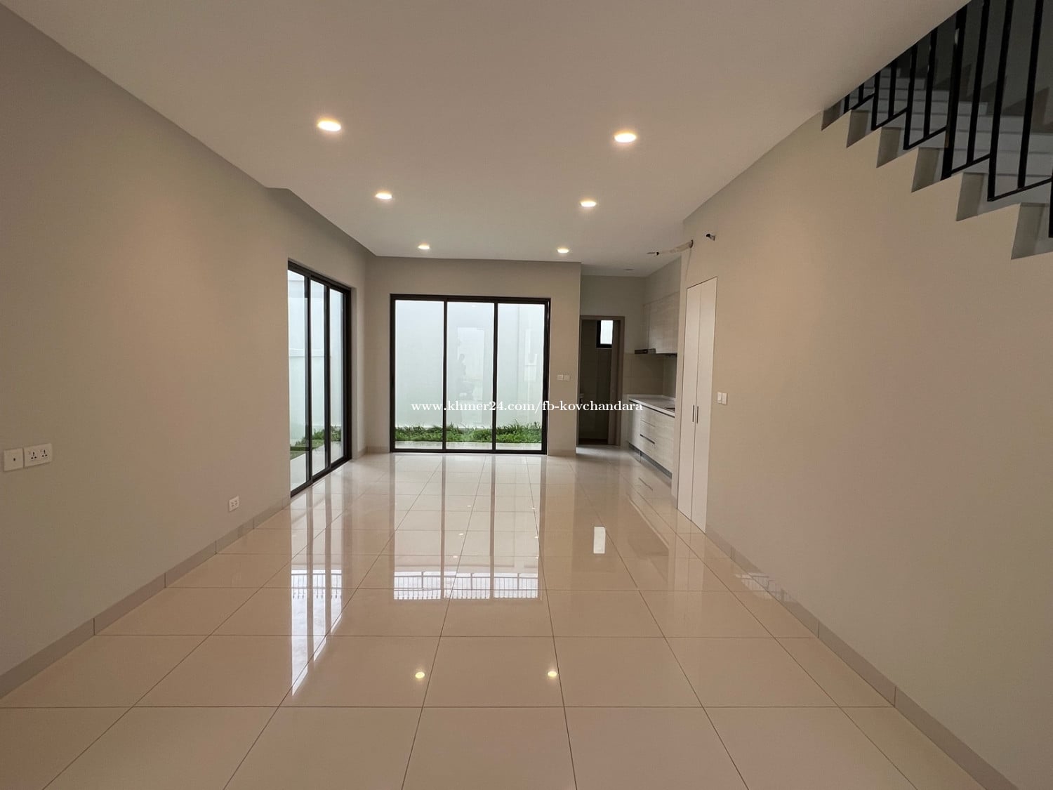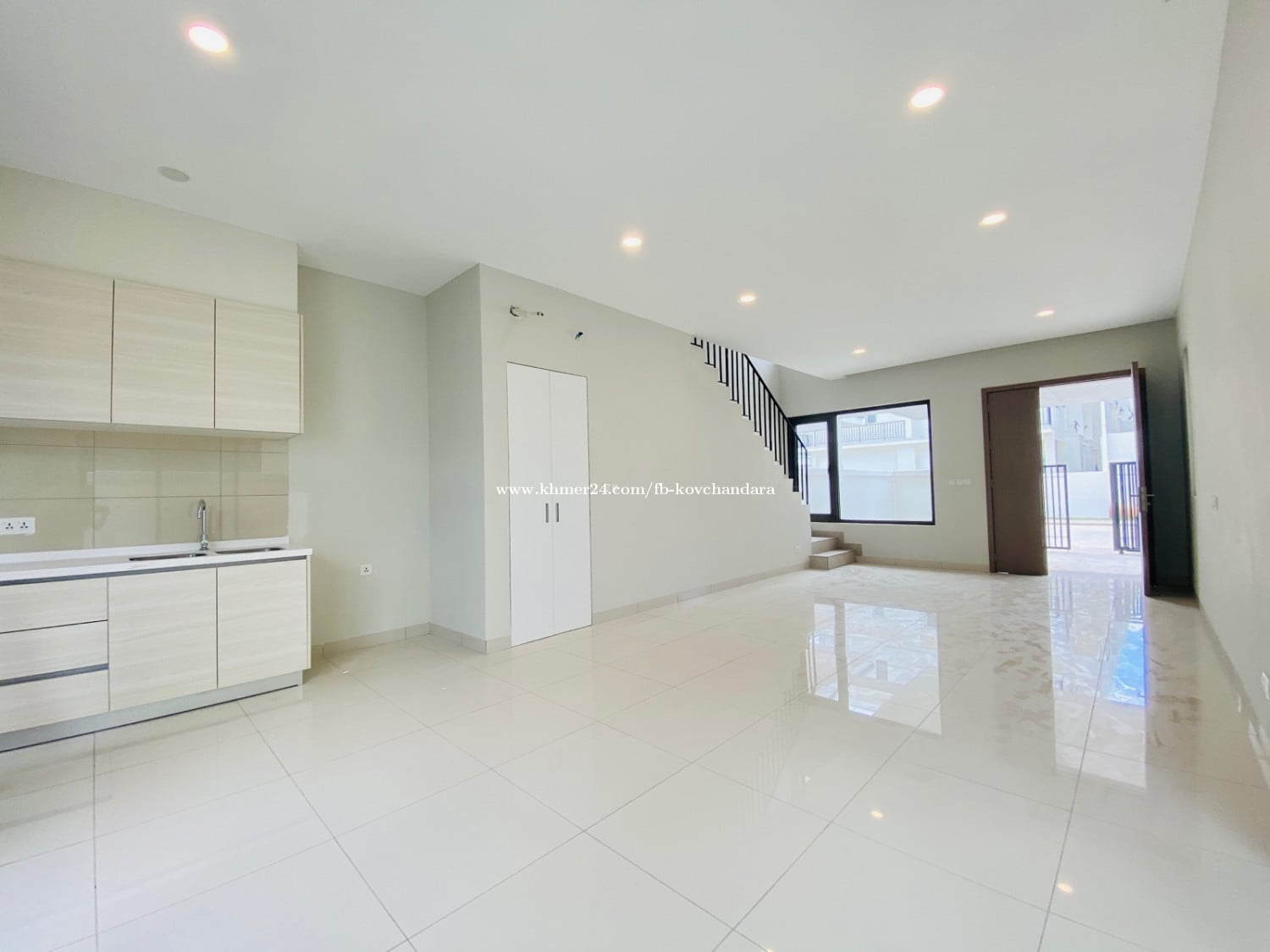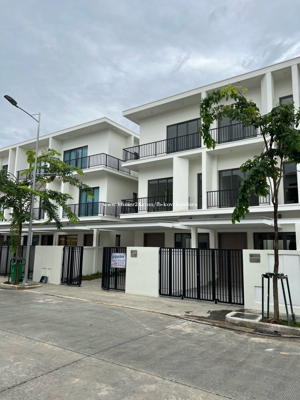 Borey chankiri链接别墅 卧室3 浴室3 侧链式房屋,有1.5米的绿地和后花园。一楼有一个开放式客厅、厨房、厕所和储藏室。一楼和二楼各有两间卧室和一间浴室。距离永旺3仅5公里,距离BKK115公里,距离新机场10公里