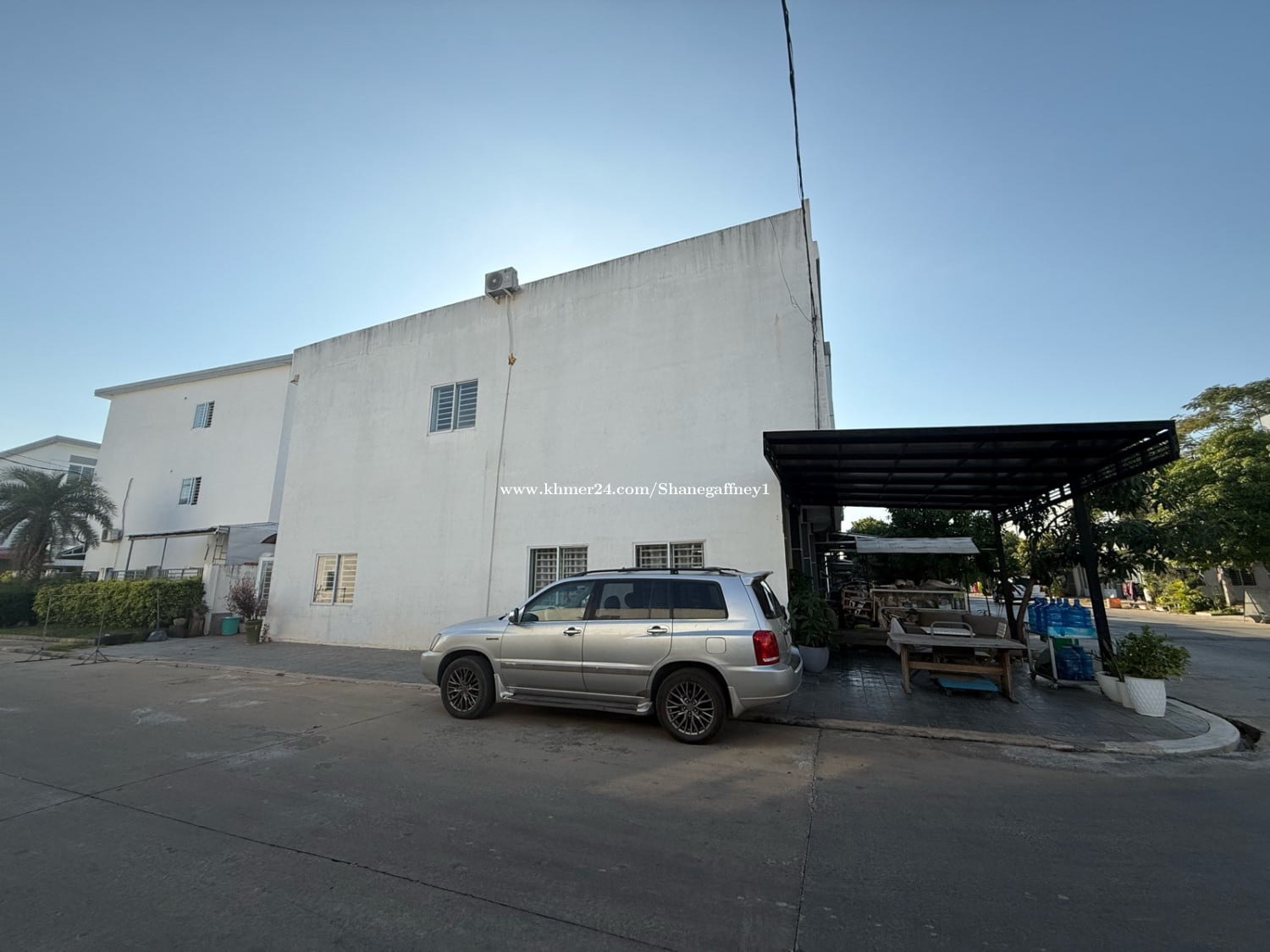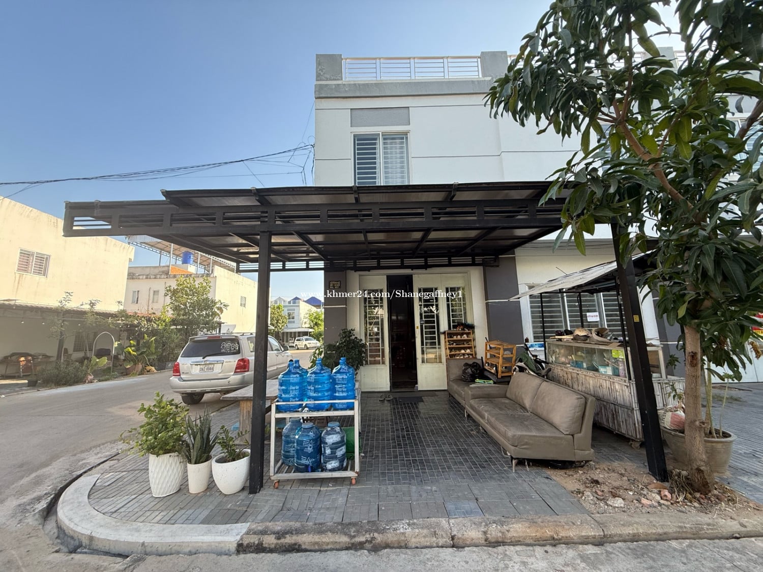 House has side land for many car parking Can use for restaurant area Tables and chairs Can cover and make shop Has land at back can also make extra room For car Top story can add 1 more floor House is in main markets street Many food shops Good place to live easy walking for everything No need to leave Price can negotiate down