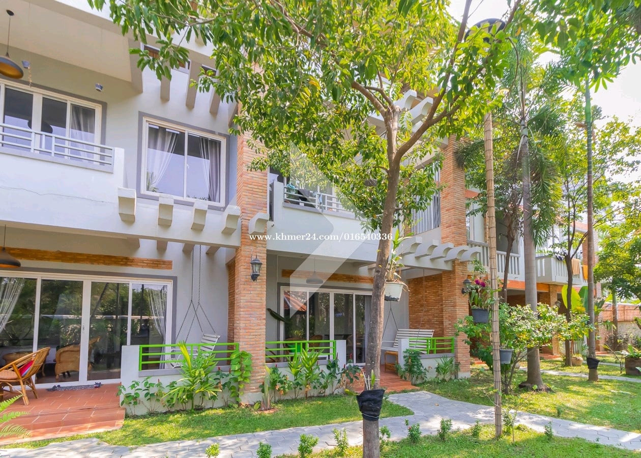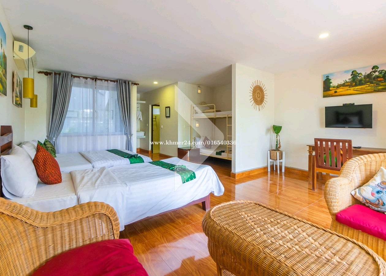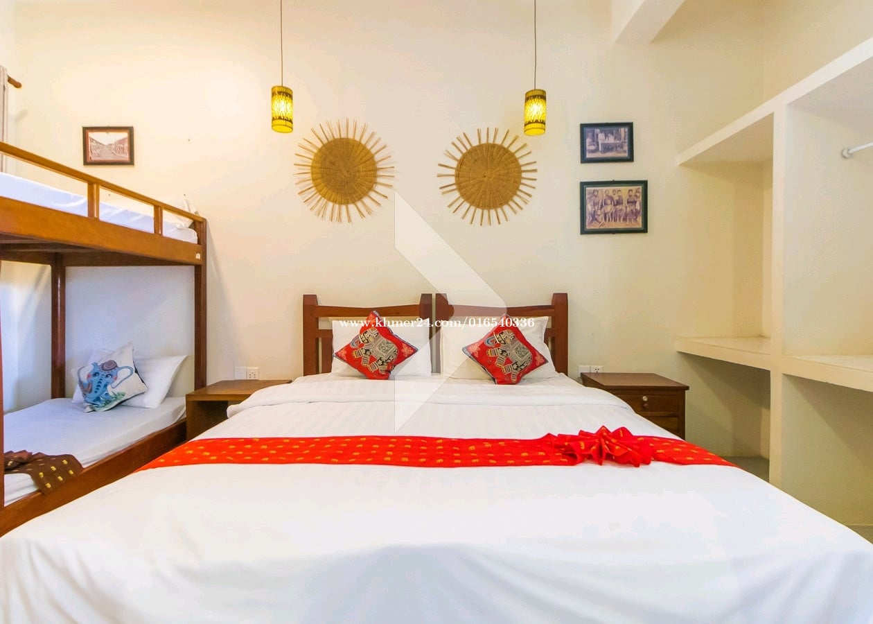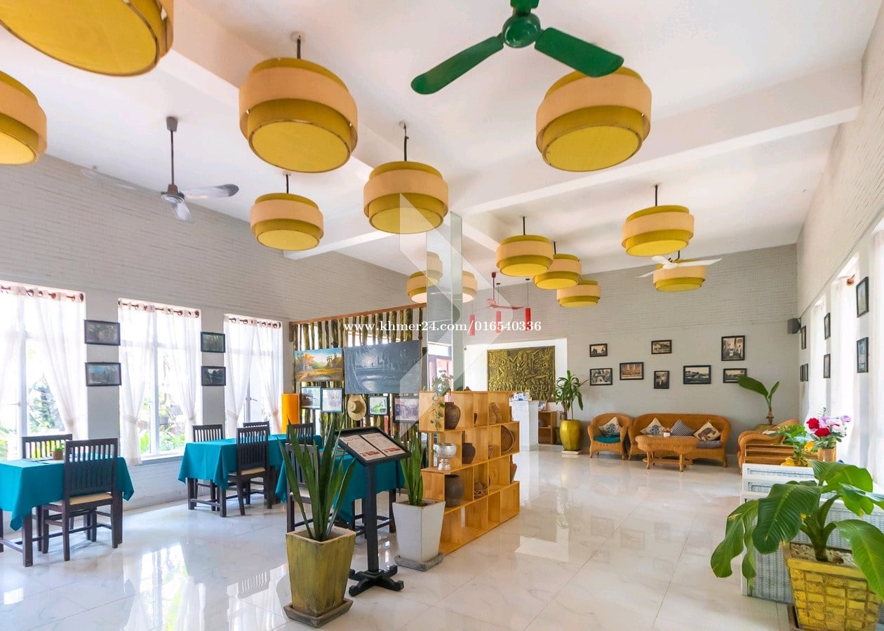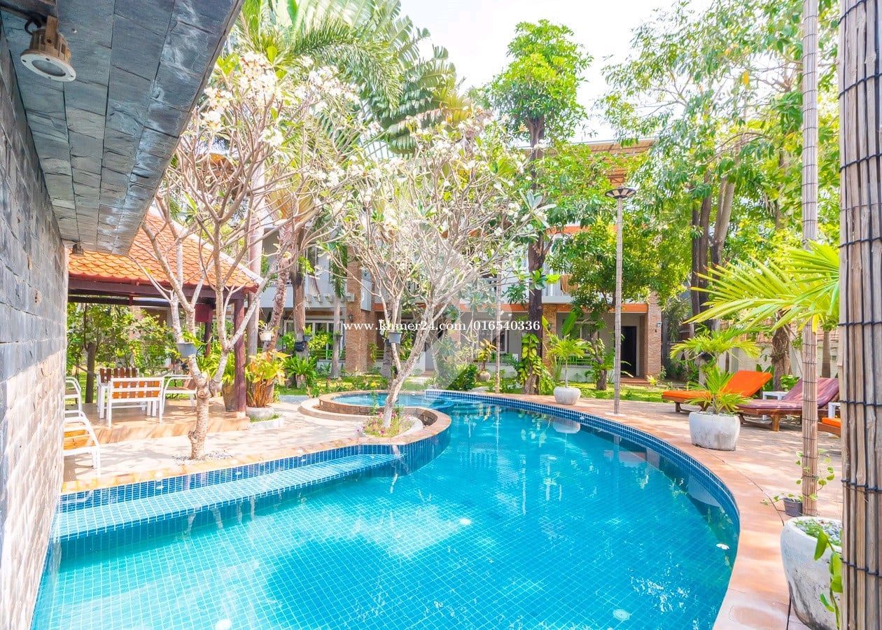 ------------------------------------------------- Rental price 2000$ • Total Land size 1200 square meters • Hard title • 13 Bedrooms • Lobby, Restaurant, Kitchen • Full furnished • Swimming pool and balcony • Security and Gate • Located in Sangkat Svay Dangkum, Siem Reap city