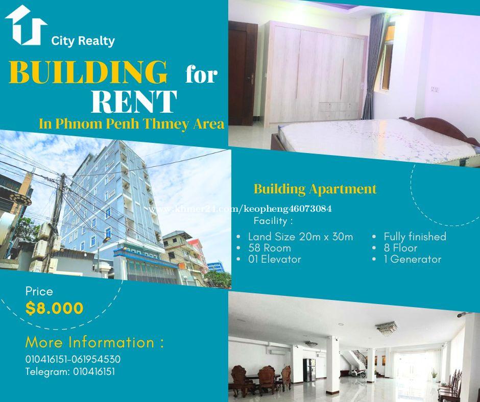 [អគារជួល ទីតាំងភ្នំពេញថ្មី] 🌟 តម្លៃ | Price: $8000/ខែ 📍ទីតាំង | LOCATION: សង្កាត់ ភ្នំពេញថ្មី | Sangkat Phnom Penh Thmey - ទំហំដី | land Size: 20m x 30m - ទំហំអគារ | Building Size: 10m x 26m - បន្ទប់គេង | Bedrooms: 54 - បន្ទប់ធំ | Office Space: 04 - បន្ទប់ទឹក | Bathrooms: 58 - កម្ពស់សរុប |Total Floors: 08 - ជណ្តើរយន្ត | Elevator: 01 - ចំណត | Parking Space - ទិស | Direction: ខាងជើង | North សូមទំនាក់ទំនងតាមរយៈលេខ៖ 010416xxxClick To Call / 061954xxxClick To Call