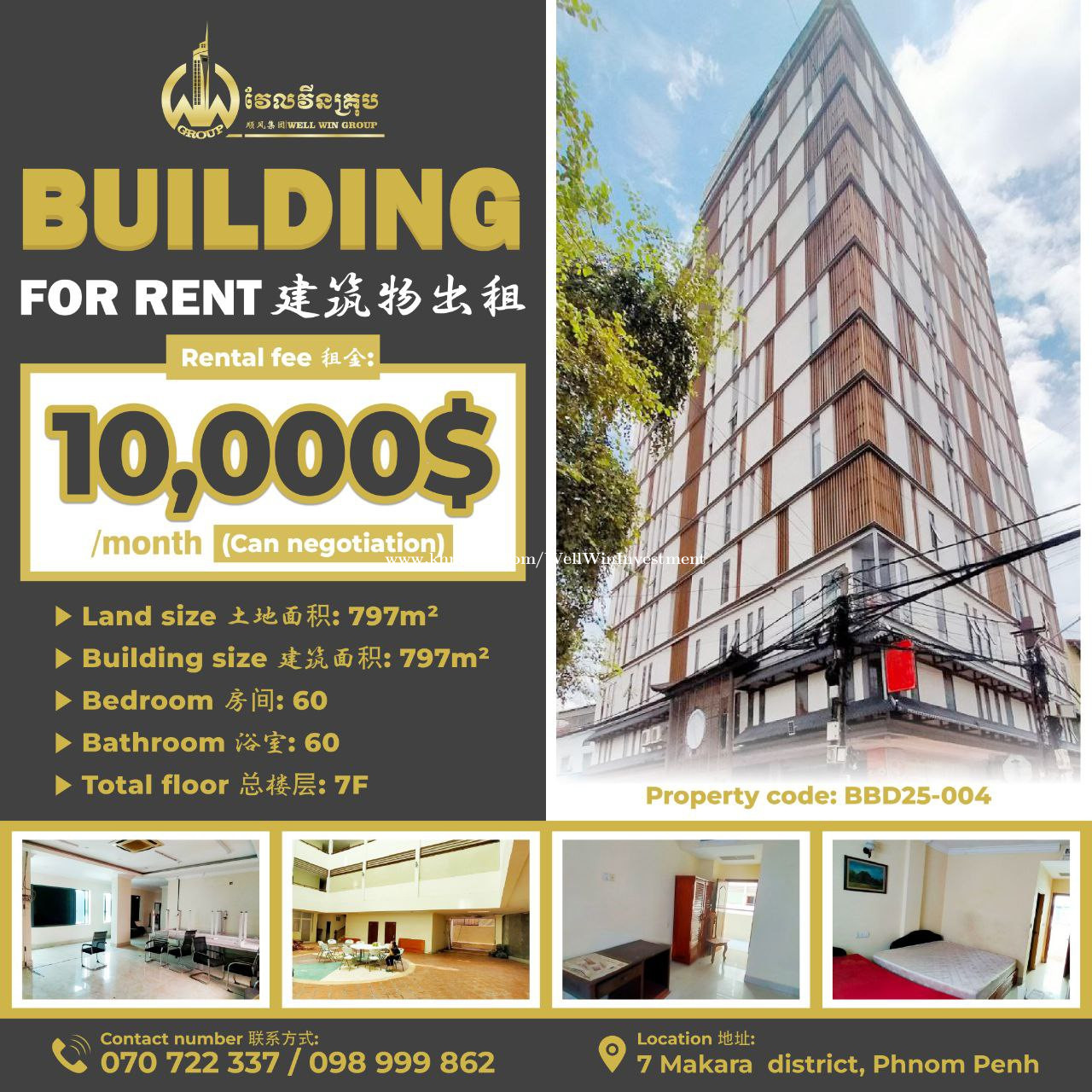 Building for rent 建筑物出租 Property code: BBD25-004 Rental fee 租金: 10,000$/month (Can negotiation) Land size 土地面积:797m² Building size 建筑面积:797m² Bedroom 房间:60 Bathroom 浴室:60 Total floor 总楼层: 7F Location 地址: 7 Makara district, Phnom Penh Contact number 联系方式: 070722xxxClick To Call / 098999xxxClick To Call