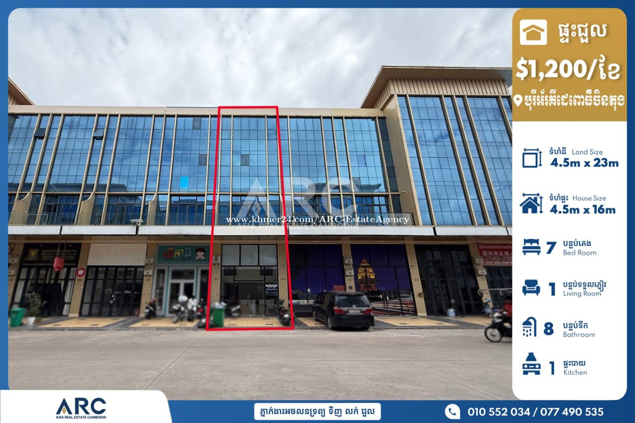 ផ្ទះអាជីវកម្មសម្រាប់ជួលស្ថិតនៅដឹព្រេមៀលែននៅជាប់ផ្សារអុីអន២ Shop House For Rent At The Premier Land Nearby Aeon2 🏷 តម្លៃជួល / 售價 $1,200 🏷 ទំហំដី 土地面積4.5x23m 🏷 បន្ទប់គេង /臥室 : 7 🏷 បន្ទប់ទឹក / 浴室 : 8 📍ទីតាំងផ្ទះជួលស្ថិតនៅដឹព្រេមៀលែននៅជាប់ផ្សារអុីអន២ ខណ្ឌសែនសុខ រាជធានីភ្នំពេញ Chat to Agent/ 聊天到電報: 010552xxxClick To Call/077490xxxClick To Call Telegram https://t.me/ARCNhemBontheaSensok Channel Telegram https://t.me/ARCMrBonthea Channel Telegram ARC: https://t.me/AsiaRealEstateCambodia Website: www.arc.com.kh អាជ្ញាប័ណ្ណ៖ EV-08-069