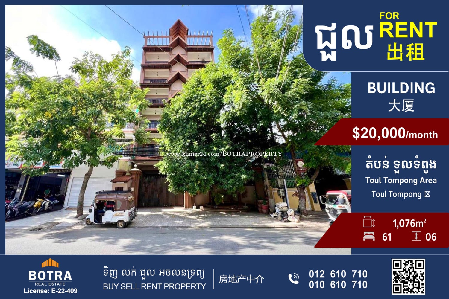 ๐ฃ Building for Rent #B1441 ๐ Location Toul Tompong Area ๐ Price: $20,000/months โข Land size: 1,076mยฒ โข Build size: 5,000mยฒ โข 1 bedroom: 42 (45mยฒ - 65mยฒ) โข 2 Bedroom: 19 (160mยฒ - 180mยฒ) โข Meeting Room: 300mยฒ โข Height: 06 floors โโโโโโโโโ Contact us now ๐ 012610xxxClick To Call (Cellcard) ๐ 010610xxxClick To Call (Smart) โถ๏ธ t.me/BotraRealEstate (Chat)