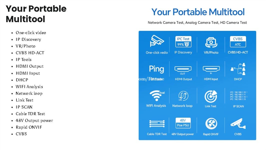 Noyafa NF-IPC728HSO Multifunctional CCTV Tester – 8" Full-HD IPS Display, ONVIF One-Click Adaptation for 99% IP & Analog Cameras, Various Network Tools, Cable Tracing & Testing, PSE Testing, OPM & VFL for Security Monitoring & Cabling Projects Website មើលលំអិតពីផលិតផល https://www.noyafa.com/collections/ipc-tester/products/nf-ipc728-cctv-tester-cable-tracer-tester-network-tools