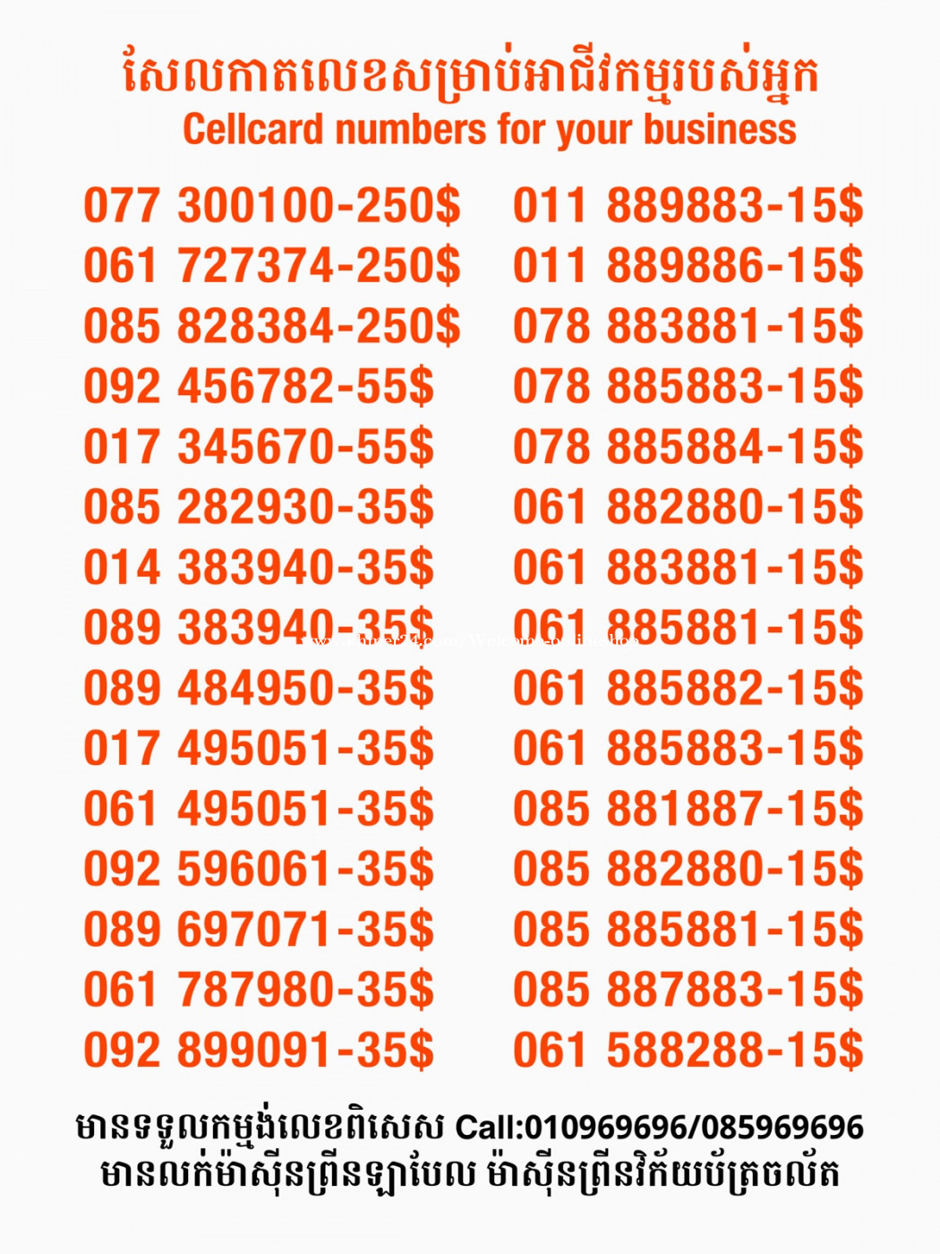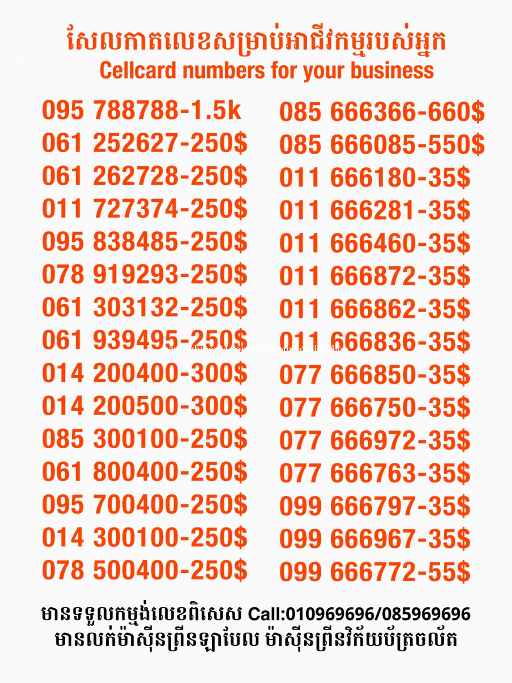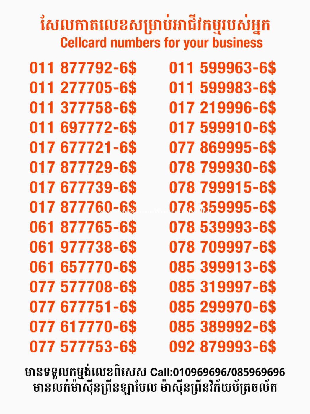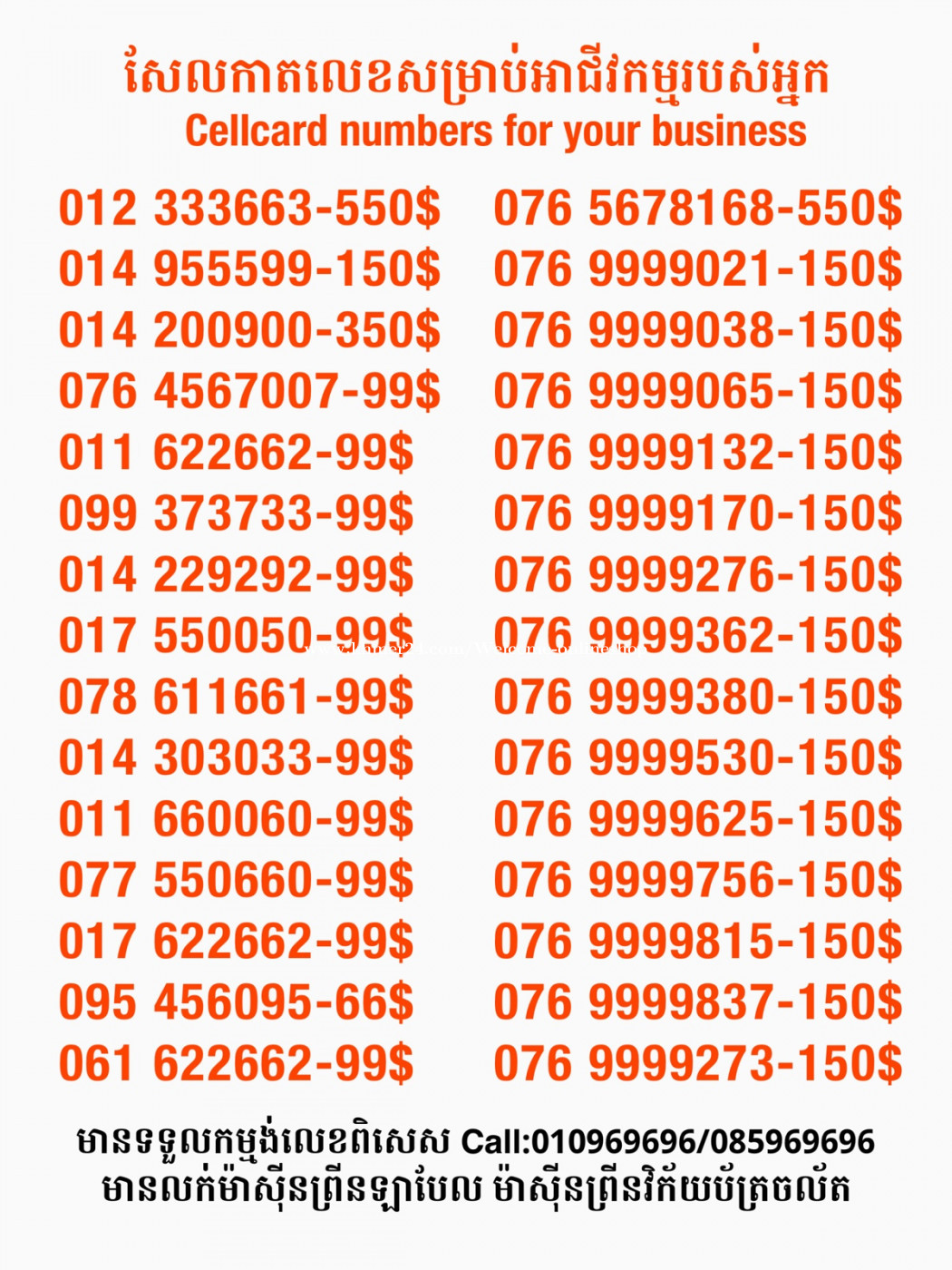 មានលក់លេខពិសេស មានទទួលកម្មង់លេខពិសេស មានលក់ម៉ាស៊ីនព្រីនឡាបែល មានលក់ម៉ាស៊ីនព្រីនវិក័យប័ត្រ មានលក់សម្ភារៈប្រើប្រាស់ក្នុងគ្រួសារ Smart Prime II 1=30$ Smart hero 1=40$ ទូរសព្ទថ្មីក្នុងប្រអប់ លក់ធូរៗរហូតអស់ពីស្តុក អាចប្រើជាឧបករណ៍សម្រាប់ស៊ែរ wifi បាន ទំនាក់ទំនង(ខ្មែរ | English | 中文):010969696 | 085969696 Telegram: https://t.me/W9696 Telegram group: https://t.me/konkonnada អាសយដ្ឋាន:ផ្ទះលេខ២៣ ផ្លូវបេតុងលេខ១ ភូមិទួលពង្រ សង្កាត់ចោមចៅ ខណ្ឌពោធិ៍សែនជ័យ រាជធានីភ្នំពេញ ទីតាំង https://goo.gl/maps/8moqW4iTHUfJEvWQ9 ដើម្បីស្វែងរកលេខអាជីវកម្មដែលលោកអ្នកពេញចិត្ត សូមចូលទៅកាន់:https://www.khmer24.com/Welcome-onlineshop