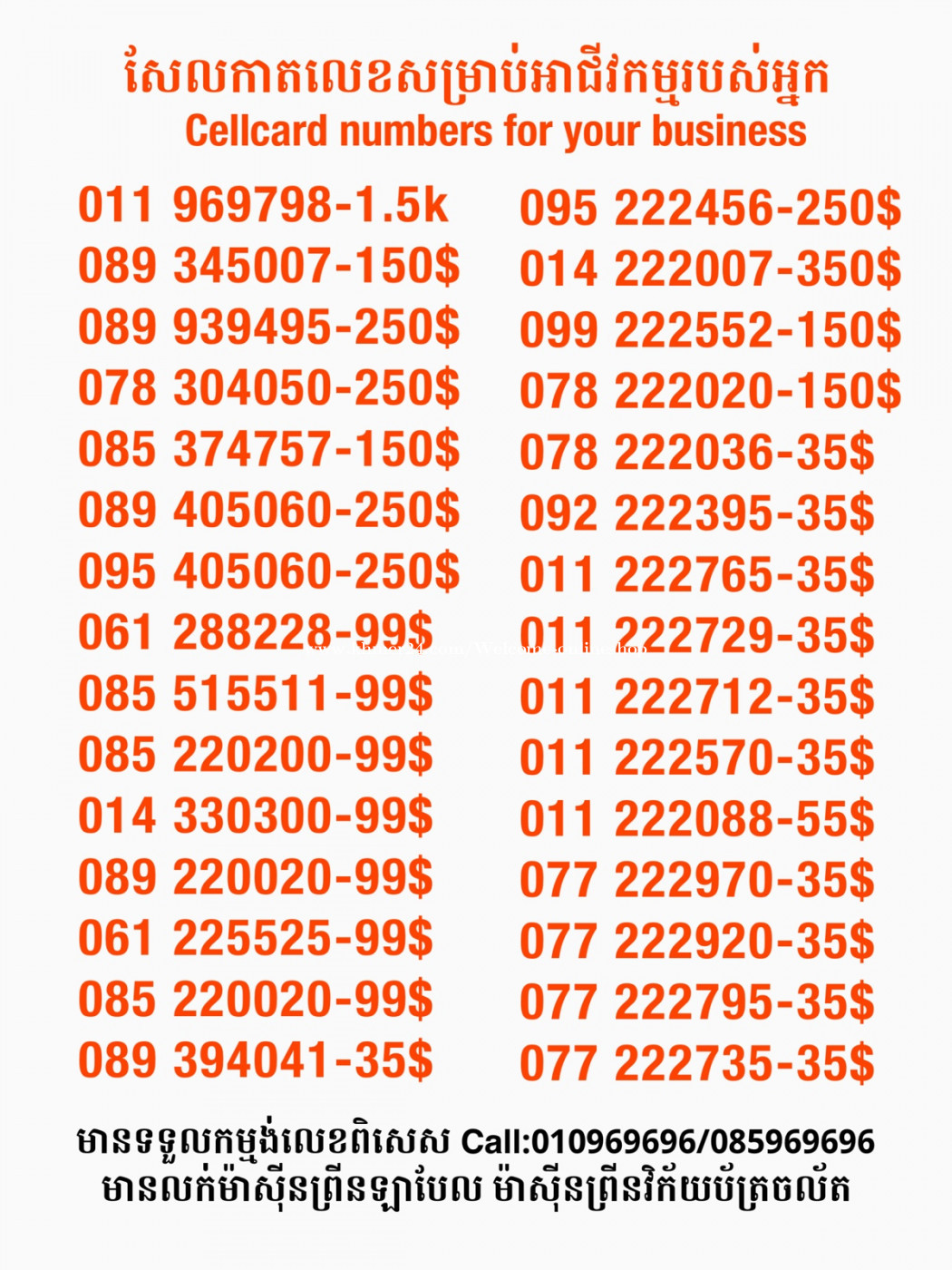 មានលក់លេខពិសេស មានទទួលកម្មង់លេខពិសេស មានលក់ម៉ាស៊ីនព្រីនឡាបែល មានលក់ម៉ាស៊ីនព្រីនវិក័យប័ត្រ មានលក់សម្ភារៈប្រើប្រាស់ក្នុងគ្រួសារ Smart Prime II 1=30$ Smart hero 1=40$ ទូរសព្ទថ្មីក្នុងប្រអប់ លក់ធូរៗរហូតអស់ពីស្តុក អាចប្រើជាឧបករណ៍សម្រាប់ស៊ែរ wifi បាន ទំនាក់ទំនង(ខ្មែរ | English | 中文):010969696 | 085969696 Telegram: https://t.me/W9696 Telegram group: https://t.me/konkonnada អាសយដ្ឋាន:ផ្ទះលេខ២៣ ផ្លូវបេតុងលេខ១ ភូមិទួលពង្រ សង្កាត់ចោមចៅ ខណ្ឌពោធិ៍សែនជ័យ រាជធានីភ្នំពេញ ទីតាំង https://goo.gl/maps/8moqW4iTHUfJEvWQ9 ដើម្បីស្វែងរកលេខអាជីវកម្មដែលលោកអ្នកពេញចិត្ត សូមចូលទៅកាន់:https://www.khmer24.com/Welcome-onlineshop