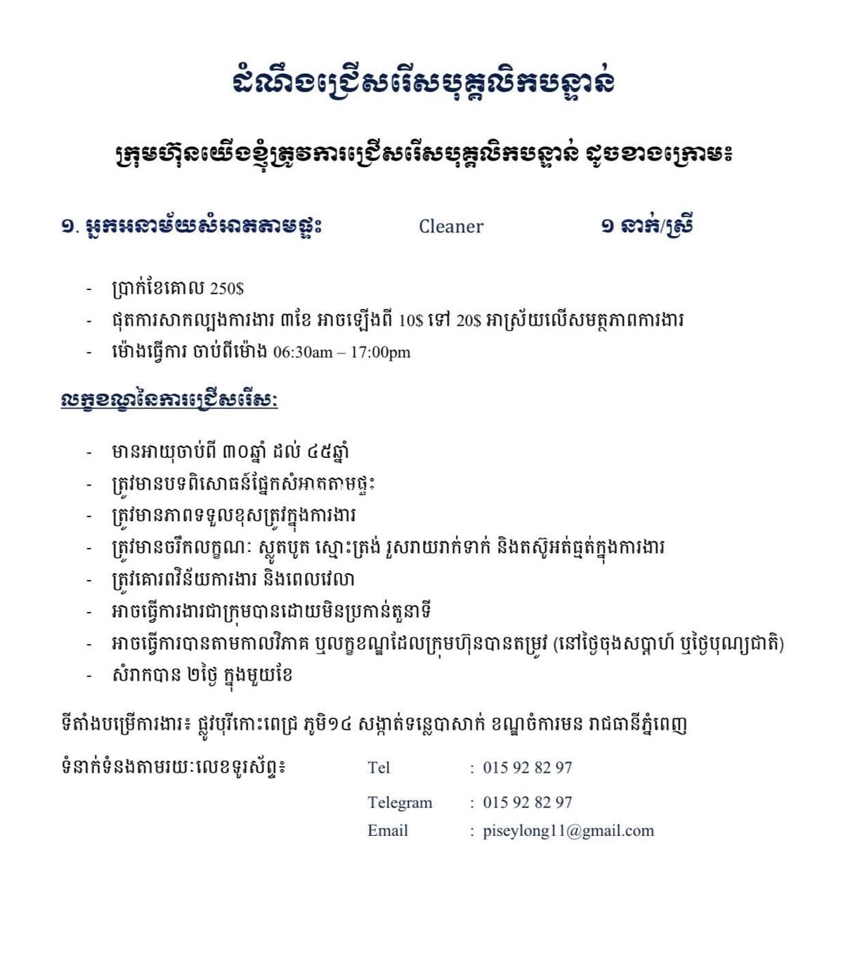 - ប្រាក់ខែគោល 250$ - ផុតការសាកល្បងការងារ ៣ខែ អាចឡើងពី 10$ ទៅ 20$ អាស្រ័យលើសមត្ថភាពការងារ - ម៉ោងធ្វើការ ចាប់ពីម៉ោង 06:30am – 17:00pm - មានអាយុចាប់ពី ៣០ឆ្នាំ ដល់ ៤៥ឆ្នាំ - ត្រូវមានបទពិសោធន៍ផ្នែកសំអាតតាមផ្ទះ - ត្រូវមានភាពទទួលខុសត្រូវក្នុងការងារ - ត្រូវមានចរឹកលក្ខណៈ ស្លូតបូត ស្មោះត្រង់ រួសរាយរាក់ទាក់ និងតស៊ូអត់ធ្មត់ក្នុងការងារ - ត្រូវគោរពវិន័យការងារ និងពេលវេលា - អាចធ្វើការងារជាក្រុមបានដោយមិនប្រកាន់តួនាទី - អាចធ្វើការបានតាមកាលវិភាគ ឬលក្ខខណ្ឌដែលក្រុមហ៊ុនបានតម្រូវ (នៅថ្ងៃចុងសបា្ដហ៍ ឬថ្ងៃបុណ្យជាតិ) - សំរាកបាន ២ថ្ងៃ ក្នុងមួយខែ ទីតាំងបម្រើការងារ៖ ផ្លូវបុរីកោះពេជ្រ ភូមិ១៤ សង្កាត់ទន្លេបាសាក់ ខណ្ឌចំការមន រាជធានីភ្នំពេញ ទំនាក់ទំនងតាមរយៈលេខទូរស័ព្ទ៖ Tel : 015928xxxClick To Call Telegram : 015928xxxClick To Call