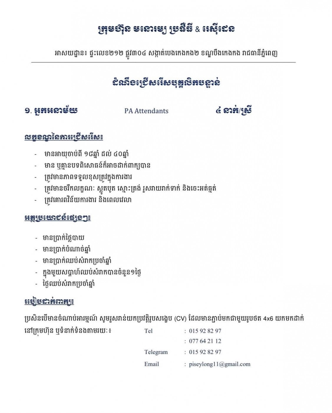 - មានអាយុចាប់ពី ១៨ឆ្នាំ ដល់ ៤០ឆ្នាំ - មាន ឬគ្មានបទពិសោធន៍ក៏អាចដាក់ពាក្យបាន - ត្រូវមានភាពទទួលខុសត្រូវក្នុងការងារ - ត្រូវមានចរឹកលក្ខណៈ ស្លូតបូត ស្មោះត្រង់ រួសរាយរាក់ទាក់ និងចេះអត់ធ្មត់ - ត្រូវគោរពវិន័យការងារ និងពេលវេលា - មានប្រាក់ថ្លៃបាយ - មានប្រាក់បំណាច់ឆ្នាំ - មានប្រាក់ឈប់សំរាកប្រចាំឆ្នាំ - ក្នុងមួយសប្តាហ៍ឈប់សំរាកបានចំនួន១ថ្ងៃ - ថ្ងៃឈប់សំរាកប្រចាំឆ្នាំ ប្រសិនបើមានចំណាប់អារម្មណ៍ សូមរួសរាន់យកប្រវត្តិរូបសង្ខេប (CV) ដែលមានភ្ជាប់មកជាមួយរូបថត 4x6 យកមកដាក់នៅក្រុមហ៊ុន ឬទំនាក់ទំនងតាមរយៈ៖ Tel : 015928xxxClick To Call Telegram : 015928xxxClick To Call