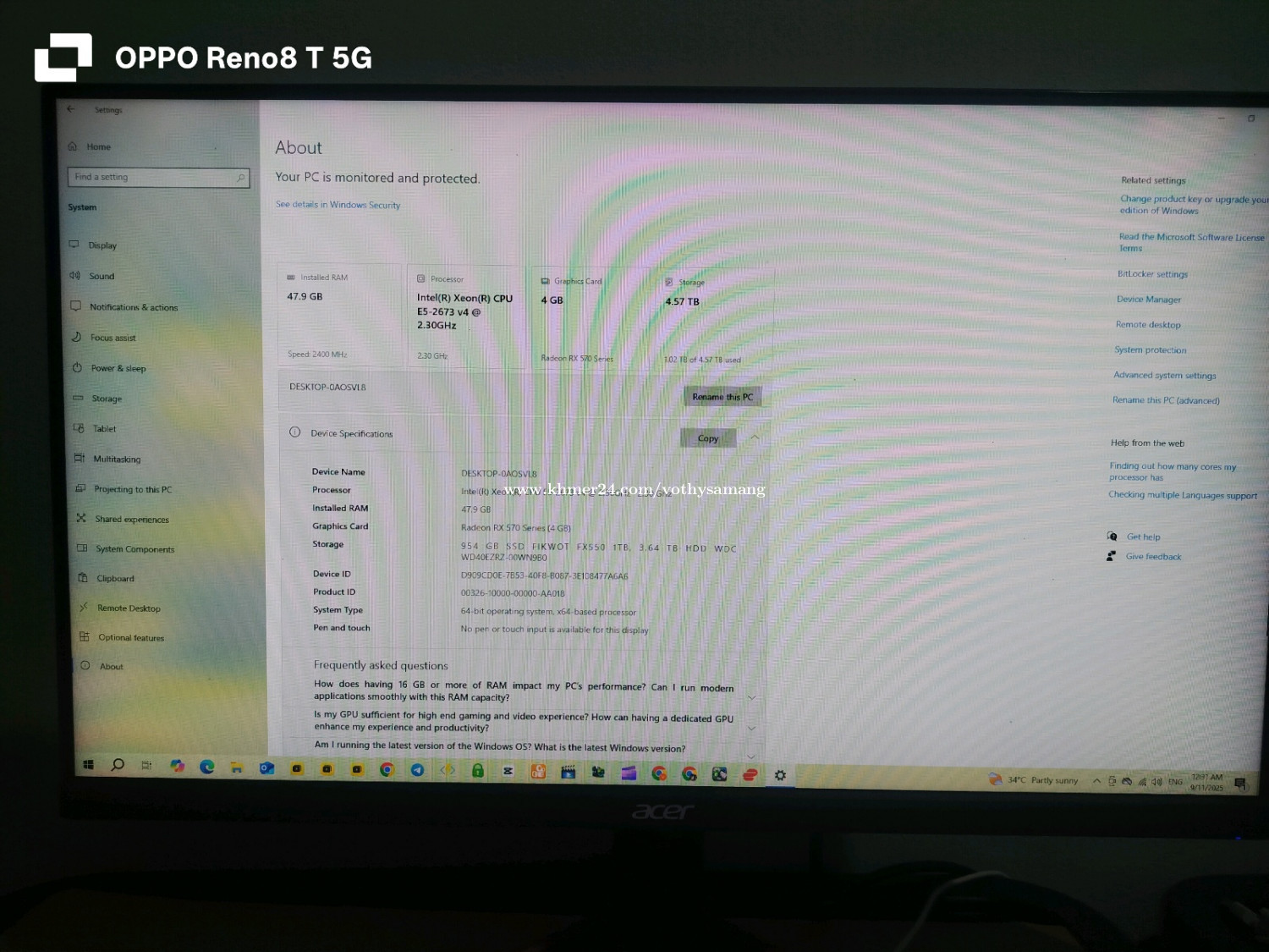 Computer ឈុត CPU xeon E5 2673 v4 Speed:3.3 GHzCores:20Threads:40T Ram 48gb. HHD 4T VGA rx570 4gb power supply 750 w មានជាមួយនឹងMonitor Acer 24" Keyboard + mouse