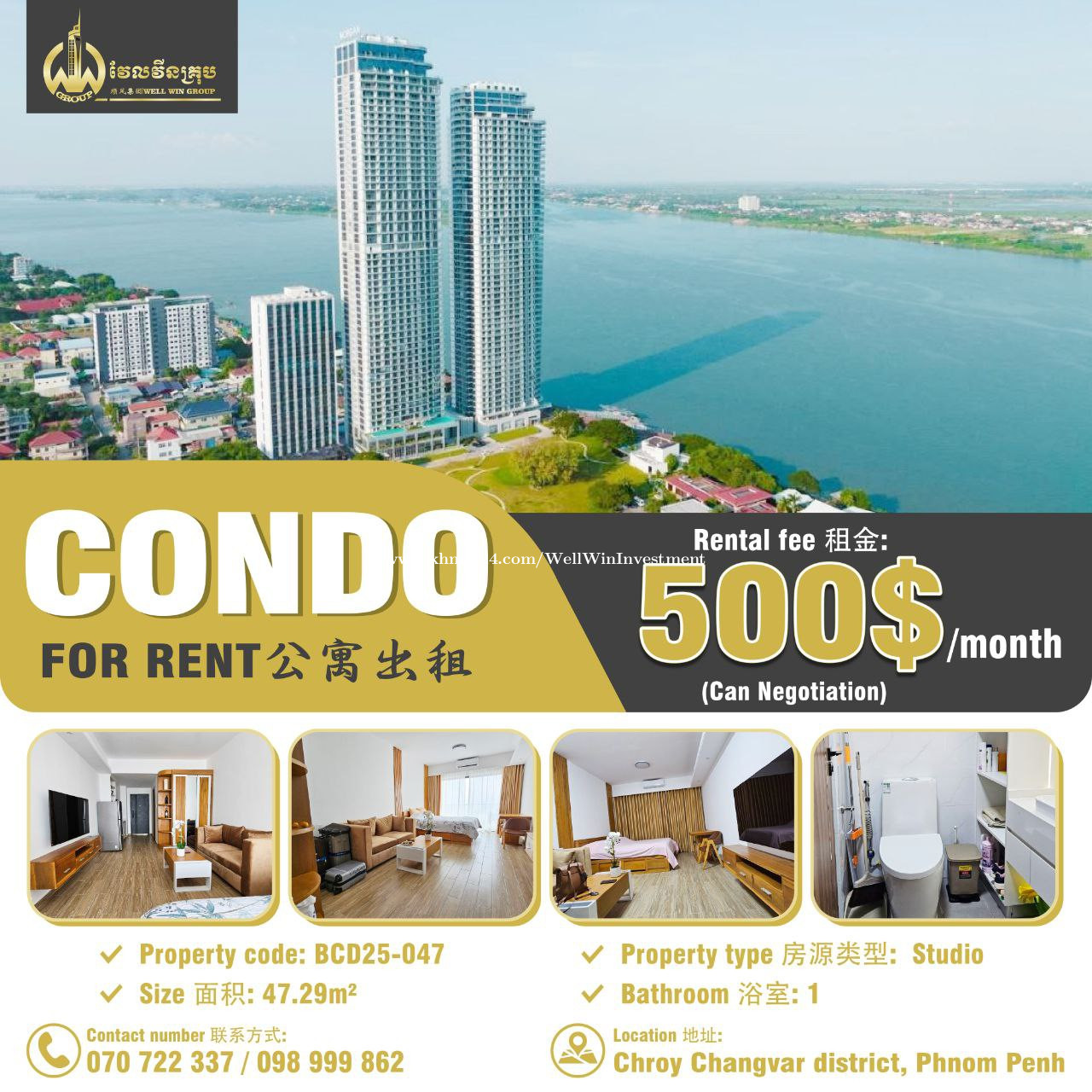 Condo for rent 公寓出租 Property code: BCD25-047 Rental fee 租金: 500$/month (Can negotiation) Size 面积: 47.29m² Property type 房源类型: Studio room Bathroom 浴室: 1 Location 地址: Chroy Changvar district, Phnom Penh Contact number 联系方式: 070722xxxClick To Call / 098999xxxClick To Call