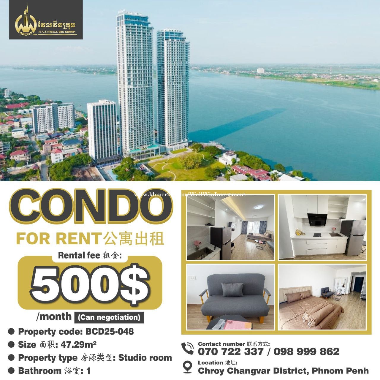 Condo for rent 公寓出租 Property code: BCD25-048 Rental fee 租金: 500$/month (Can negotiation) Size 面积: 47.29m² Property type 房源类型: Studio room Bathroom 浴室: 1 Location 地址: Chroy Changvar district, Phnom Penh Contact number 联系方式: 070722xxxClick To Call / 098999xxxClick To Call