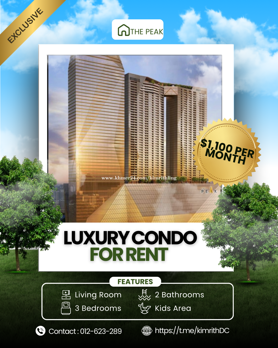 CONDO FOR RENT, THE PEAK Rent : 1100$, last price 1000$ 3-BEDROOM|2-BATHROOM Unit : 4614 Floor : 46 SIZE: 127 Sqm If you are interested, please contact us now : 📲 012623xxxClick To Call 📲016456xxxClick To Call 📲 069563xxxClick To Call 📤 https://t.me/kimrithDC
