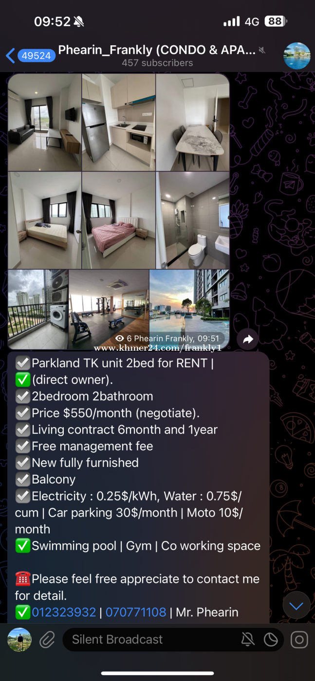 ☑️Parkland TK unit 2bed for RENT | ✅(direct owner). ☑️2bedroom 2bathroom ☑️Price $550/month (negotiate). ☑️Living contract 6month and 1year ☑️Free management fee ☑️New fully furnished ☑️Balcony ☑️Electricity : 0.25$/kWh, Water : 0.75$/cum | Car parking 30$/month | Moto 10$/month ✅Swimming pool | Gym | Co working space ☎️Please feel free appreciate to contact me for detail. ✅012323xxxClick To Call | 070771xxxClick To Call | Mr. Phearin frankly ✅https://t.me/Phearin_Frankly01 ➡️Check other room channel ✅ https://t.me/apartmentcondorental ✅012755xxxClick To Call | 010778xxxClick To Call | Ms. Meyly ✅https://t.me/meylycondo ➡️Check other room channel ✅https://t.me/mey_ly99999 Thanks with respectfully.