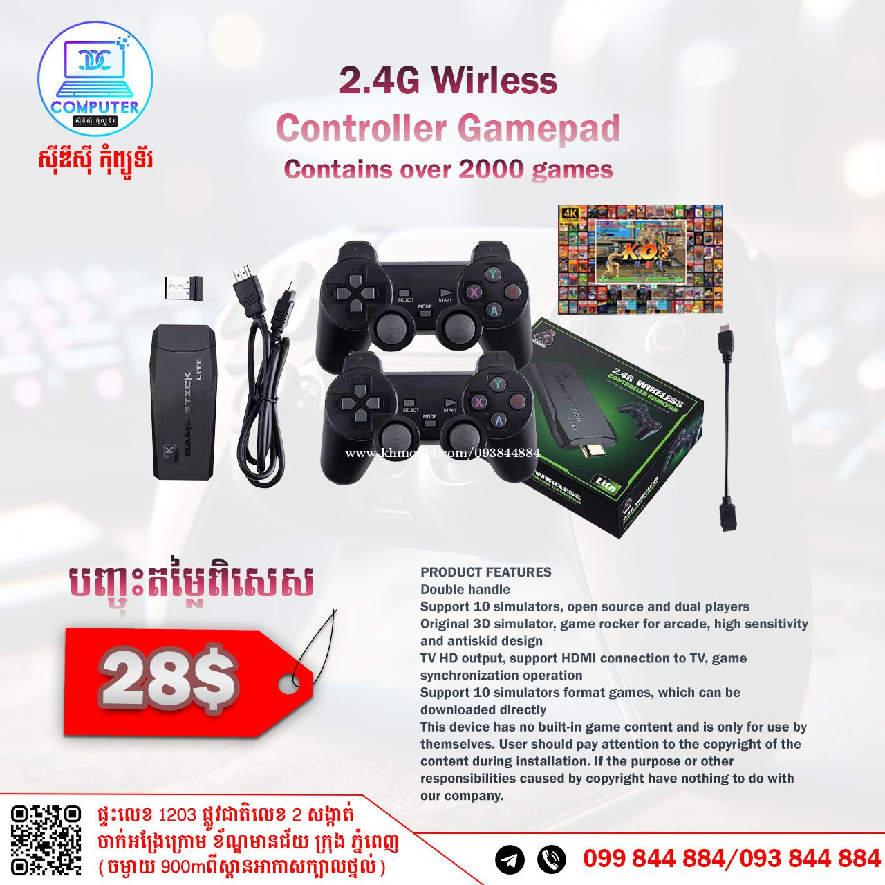 Controller Gamepad Include 2000 Games New in box 100% Price 28$ CDC COMPUTER 🖥 ☎️ ទូរស័ព្ទលេខ : 093844xxxClick To Call / 099844xxxClick To Call Telegram : t.me/CDCCOMPUTER093 🏠 ទីតាំងហាង : ផ្ទះលេខ 1203 ផ្លូវជាតិលេខ2 ចាក់អង្រែលើ ខ័ណ្ឌមានជ័យ ភ្នំពេញ (ចំងាយពីស្ពានអាកាសក្បាលថ្នល់ 900ម៉ែត្រ) 📍 Google map : https://maps.app.goo.gl/R3W9thPP5omgsMaZA