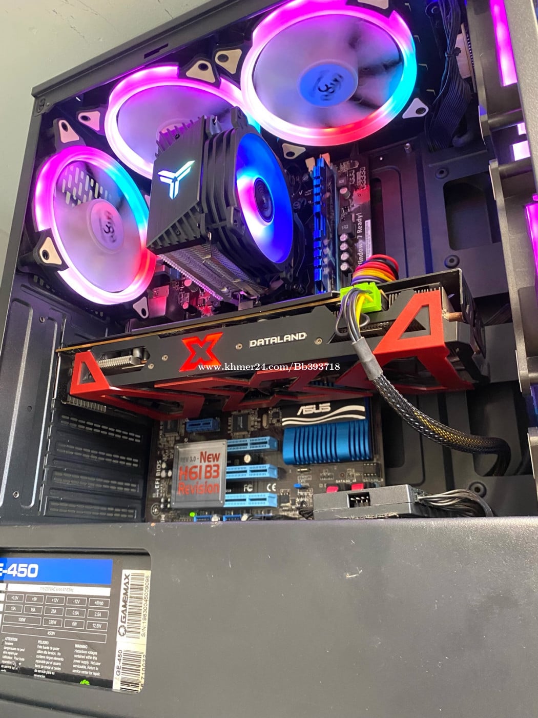 CPU : Intel Core i7-2600 (3.60GHz) RAM : Corsair DDR3 8G (1600MHz) MB : Asus PBH61 B3 ATX (2/3Gen) SSD : Colorful 128G (Window10Pro) HDD : SEAGATE 500G (Drive D SATA) PSU : GAMEMAX 450 (Original Full) CASE : InPower ATX (កញ្ចក់មុខចំហៀង) COOLER : Jonsbo CR 1200 (RGB Rainbow) FAN CASE : Aigo (RGB Remote Control X6) GPU : AMD XFX RX 570 4G Gaming (GDDR5)