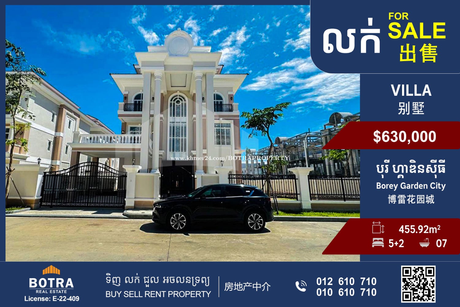 ๐ก Corner Villa for Sale #P1256 ๐ Located in Borey Garden City - Land Size: 455.92m2 - Villa Size: 11m x 11.3m - Bedrooms: 5+2 | Bathrooms: 7 ๐ Price: $630,000 (Negotiable) โโโโโโโโโ Contact us now ๐ 012610xxxClick To Call (Cellcard) ๐ 010610xxxClick To Call (Smart) โถ๏ธ t.me/BotraRealEstate (Chat)