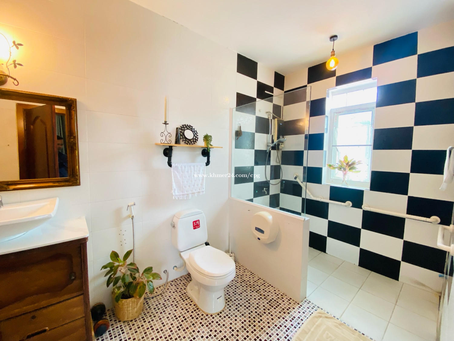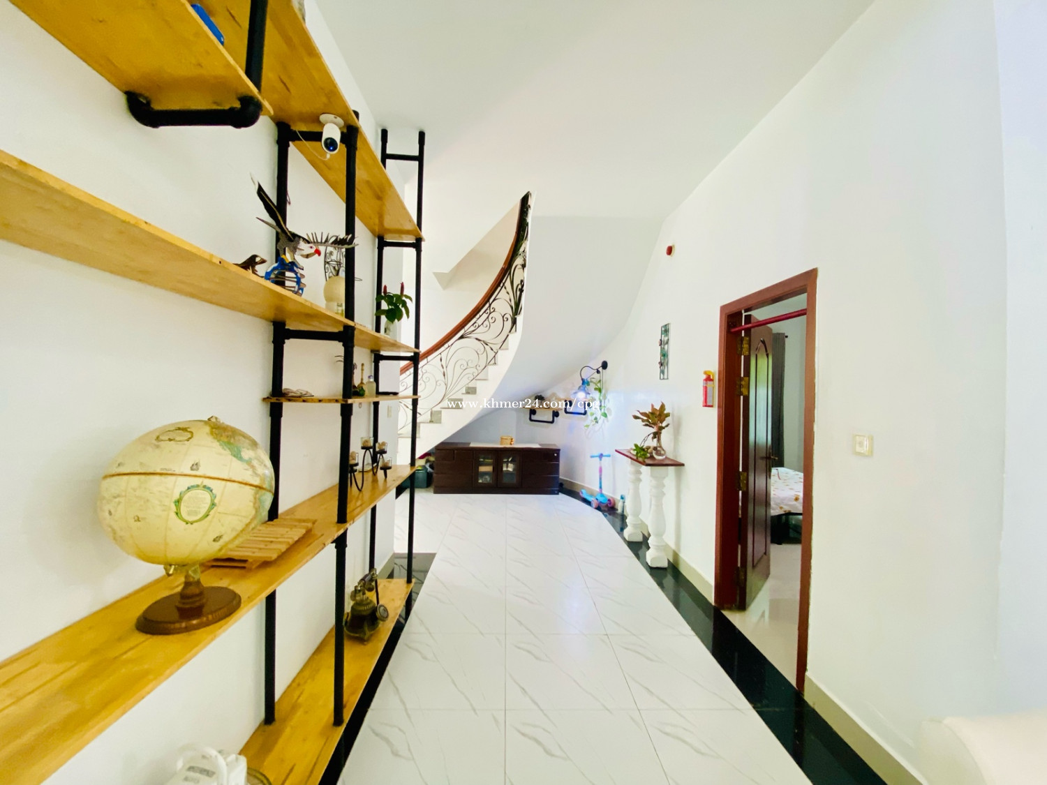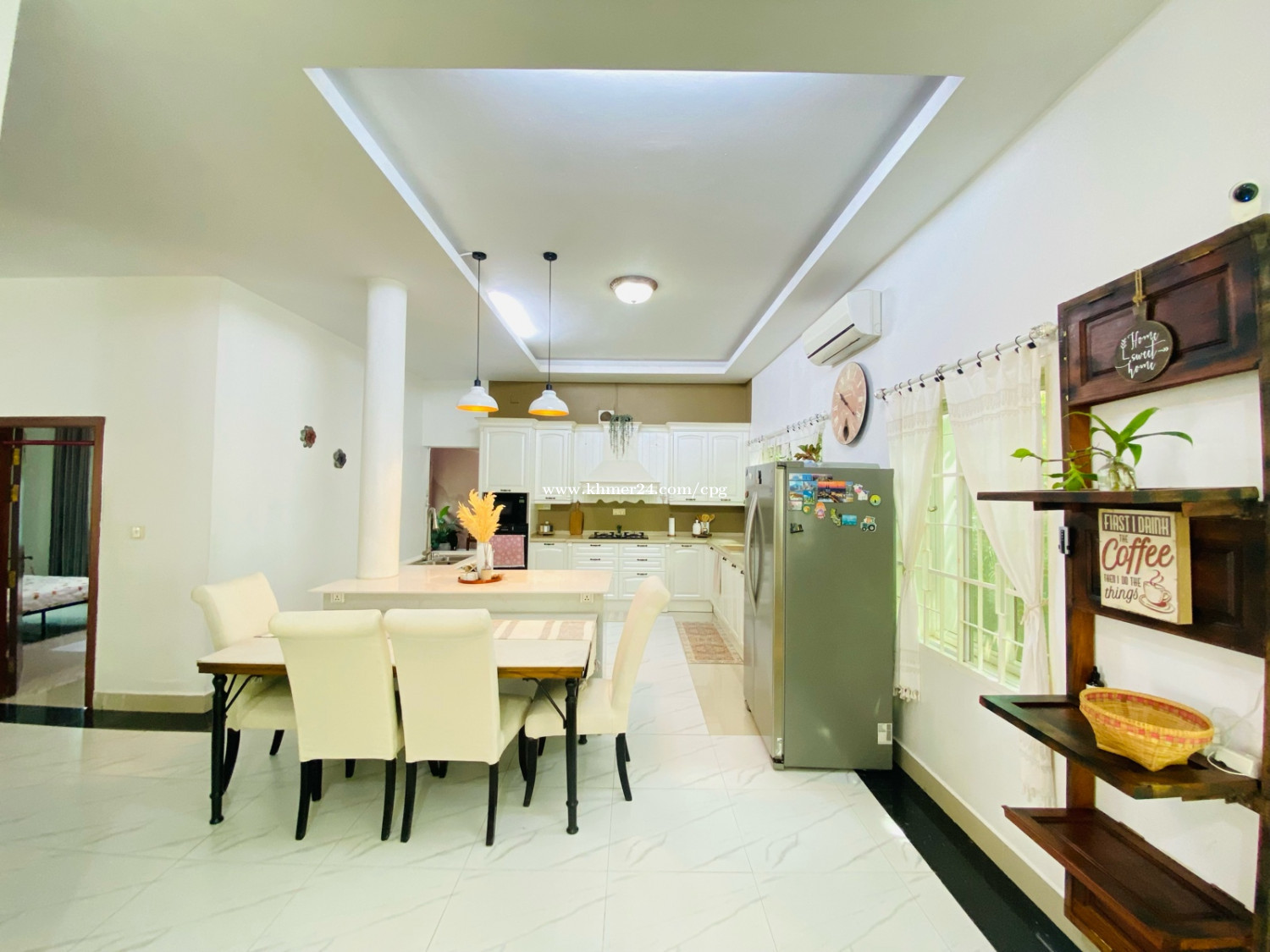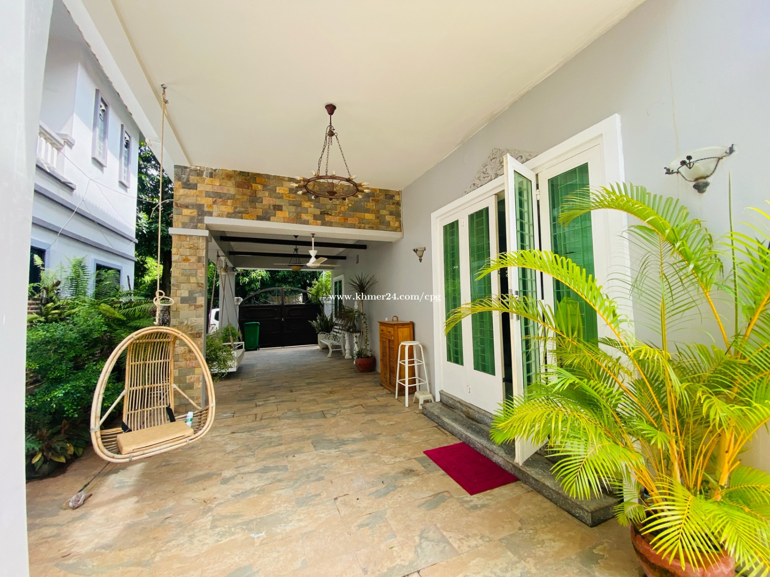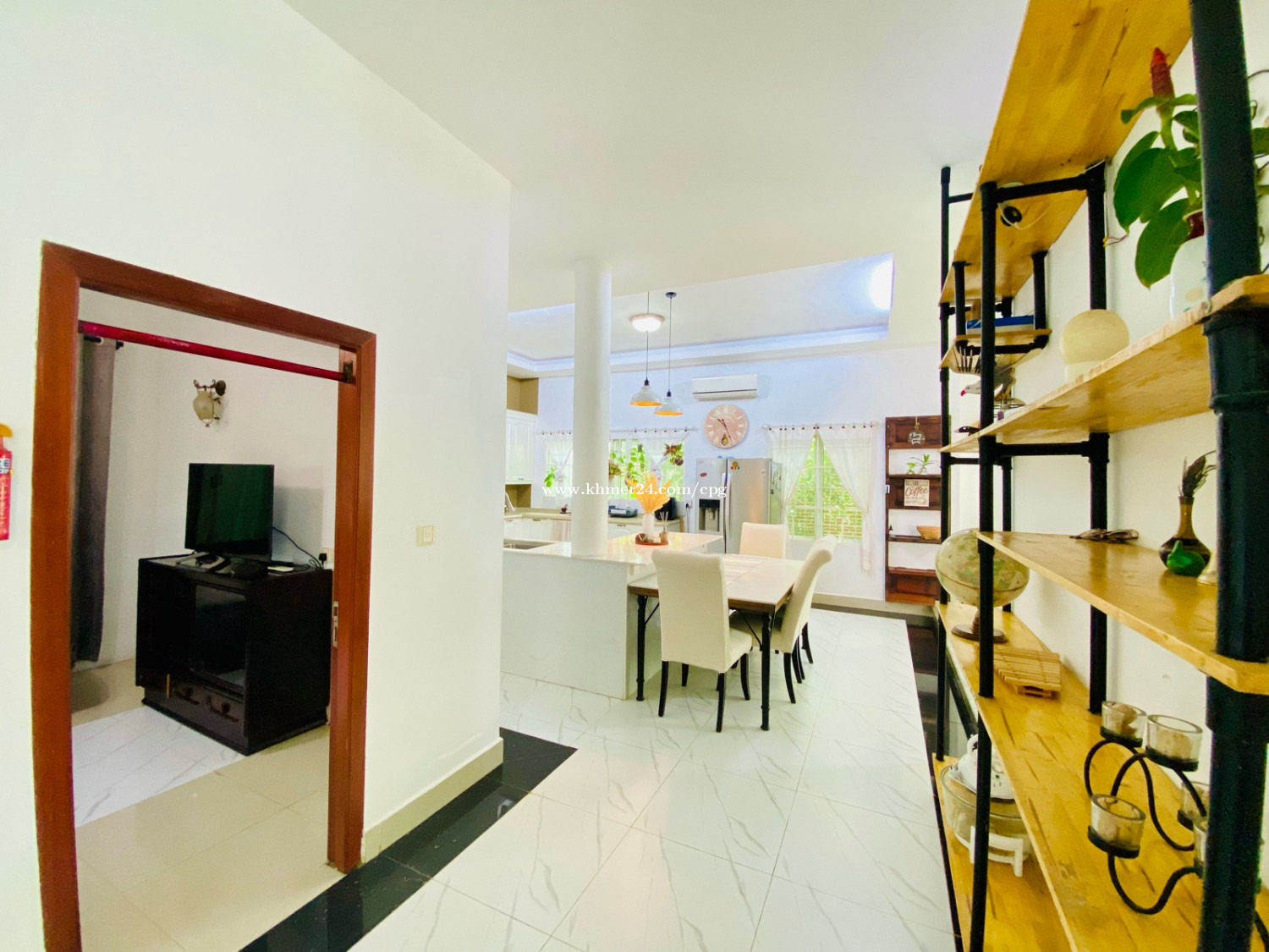 A cozy and Beautiful Villa With Wall brick Designed Villa Rent Now. 📍Location: Chroy Changva, 200m from Japanese Bridge, or five minutes from French Embassy. • Rental Price: $1,500 Per Month • Land Size: 15m x 18m • Bedroom: 4 plus 1office (3Regular+1Master Room) • Bathrooms: 5 • Floor: Eo (1Room plus 1office), E1: 3Room) • Fully Furnished; TV, Full set of bed, Rattan Safe, Real Wooden Wardrobe, Big Fridge, Washing Machine, A/C, Dish dryer, Microwave, Stovetop.