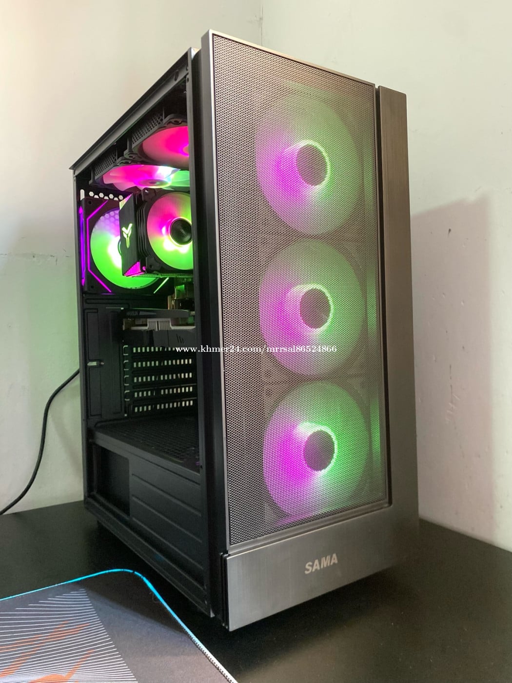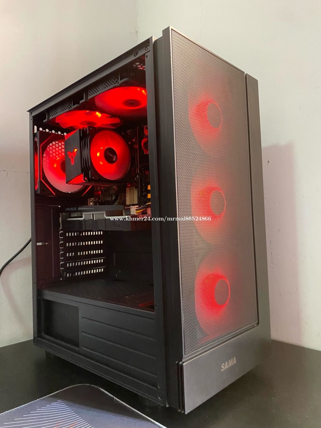 CPU : Intel Core i3 8100 (3.40GHz) RAM : Geil DDR4 16G (2666MHz) MB : Asus B365M-KYLIN (8/9th Gen) SSD : TOSHIBA 128G (Window10Pro) HDD : SEAGATE 500G (Drive D SATA) PSU : GAMEMAX 450W (Original Full) CASE : SAMA GAMING ATX (កញ្ចក់ចំហៀង) COOLER : Jonsbo CR-1400 (ARGB Sync) FAN CASE : SNOWMAN (ARGB Sync X6) GPU : Maxsun AMD RX 560 4G (GDDR5)