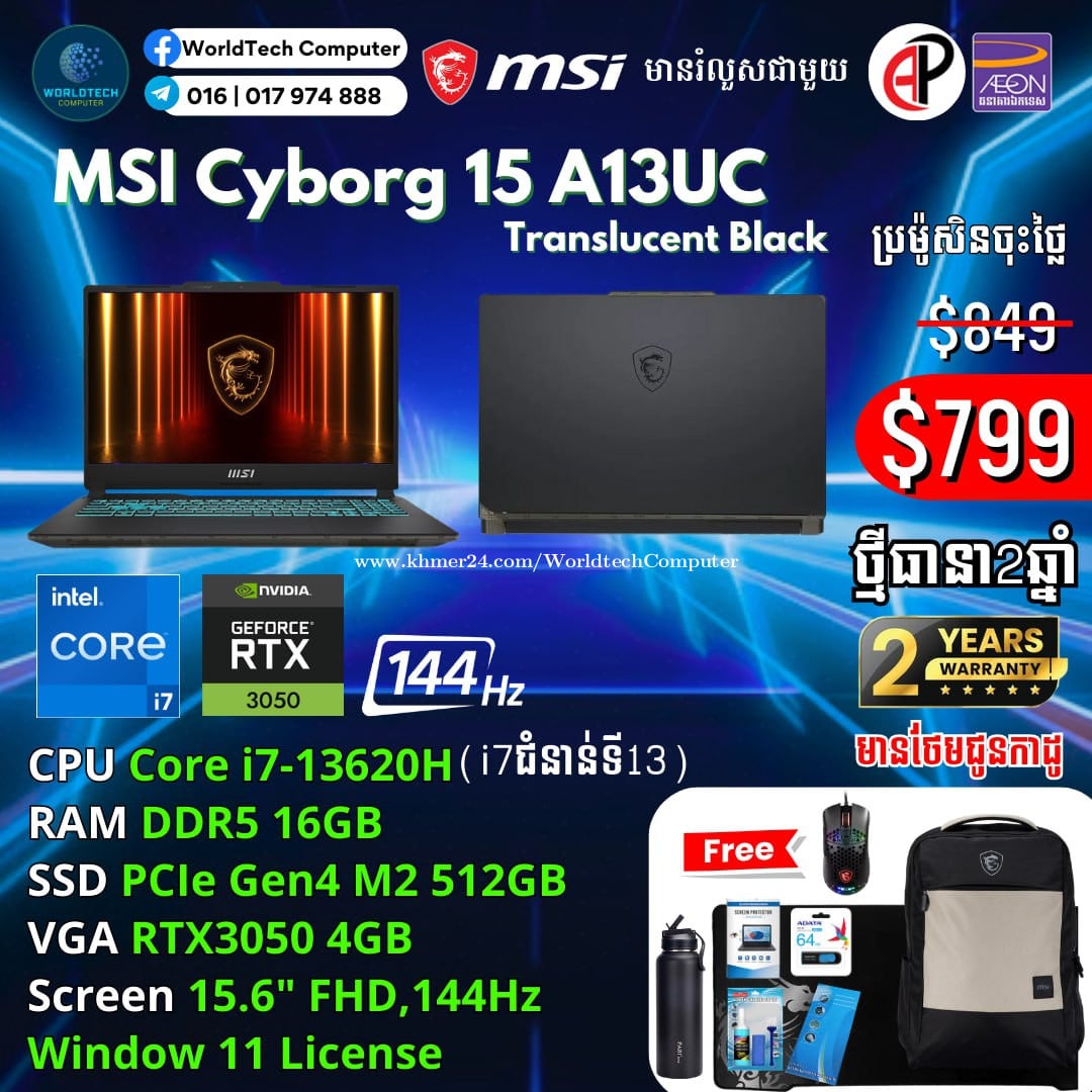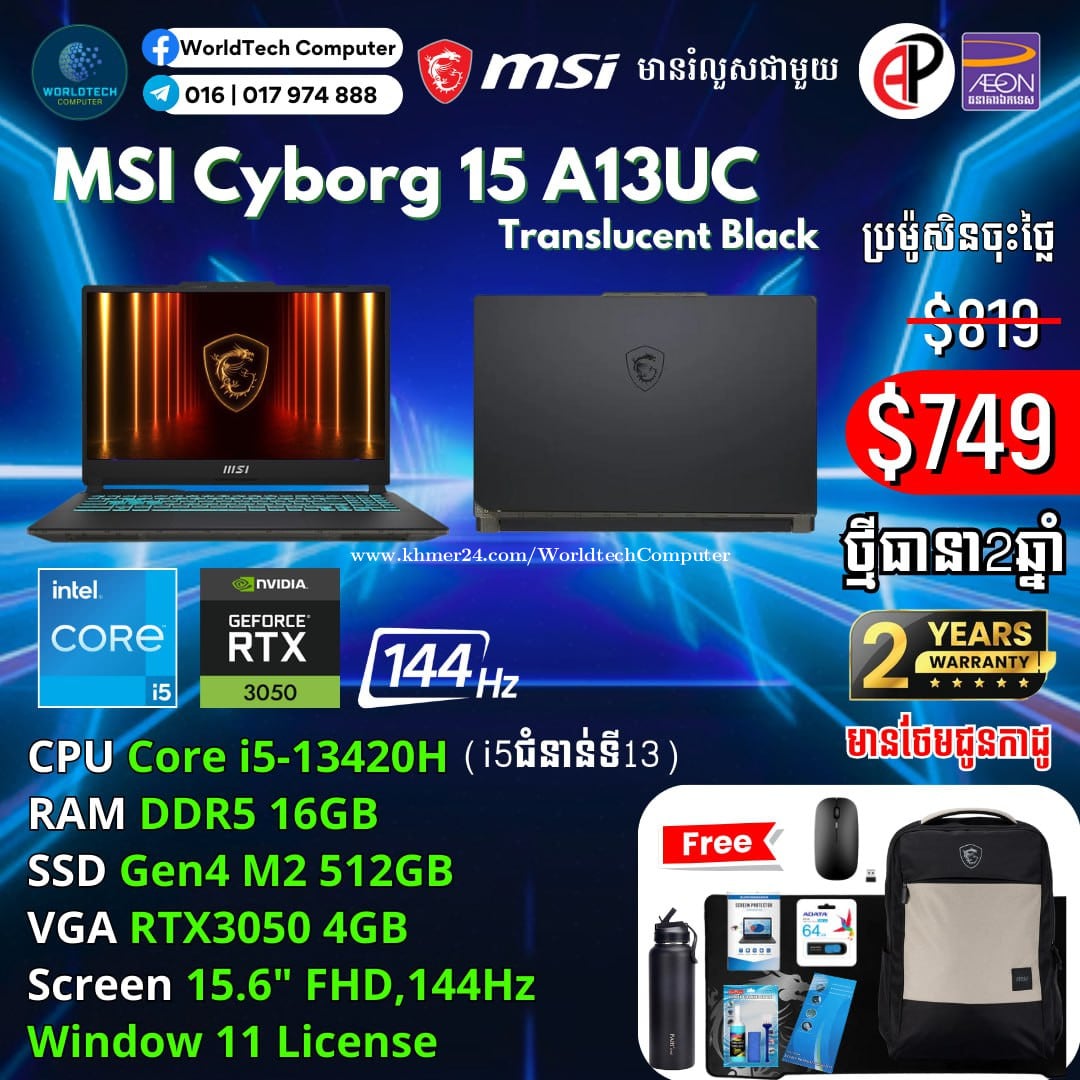 New (Gaming+Design) 2025 ធានា2ឆ្នាំ Warranty 2years from MSI Cambodia Cyborg15 i5-13420H RAM DDR5 8G M2 512GB RTX3050 4G 15.6" 144Hz New=699$ Cyborg15 i5-13420H 16G M2 512GB RTX3050 4G 15.6" 144Hz New=749$ Cyborg15 i7-13620H 16G M2 512GB RTX3050 4G 15.6" 144Hz New=799$ Cyborg15 i7-13620H 16G M2 512GB RTX4050 6G 15.6" 144Hz New=899$ Cyborg15 i7-13620H 16G M2 1TB RTX4050 6G 15.6" 144Hz New=949$ Cyborg15 i7-13620H 16G M2 512GB RTX5060 8G 15.6" 144Hz New=1049$ Cyborg17 Cyborg17 i7-13620H 16G M2 512GB RTX5050 8G 17.3" 144Hz New=1049$ Cyborg17 i7-13620H 16G M2 512GB RTX5060 8G 17.3" 144Hz New=1199$ Telegram: 017974xxxClick To Call , 011777xxxClick To Call ទីតាំងហាង: ផ្ទះ39Eo ផ្លូវ257 ទឹកល្អក់3 ទួលគោក ភ្នំពេញ (ខាងលិចស្តុបទេពផនប្រហែល 300ម)។ Location: #39E0 St257, Tuol Kouk , Tuek L'ak Bei , Phnom Penh