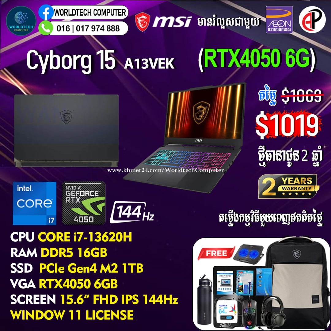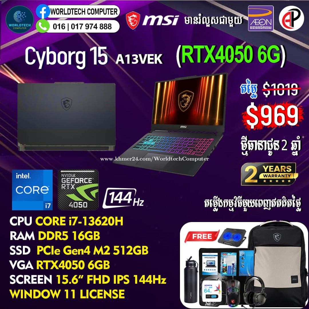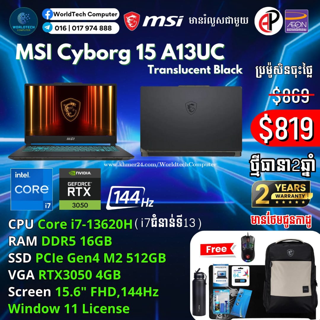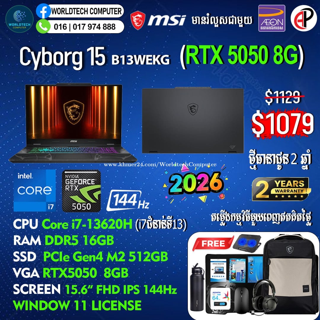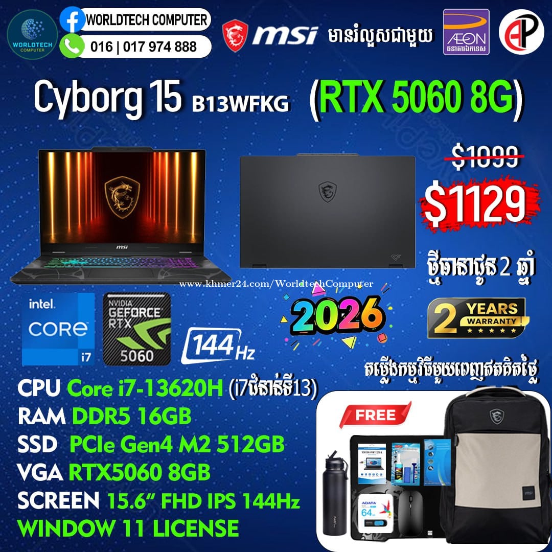 New (​Gaming+Design) 2025 ធានា2ឆ្នាំ Warranty 2years from MSI Cambodia Cyborg15 i5-13420H RAM DDR5 8G M2 512GB RTX3050 4G 15.6" 144Hz New=719$ Cyborg15 i7-13620H 16G M2 512GB RTX3050 4G 15.6" 144Hz New=819$ Cyborg15 i7-13620H 16G M2 512GB RTX4050 6G 15.6" 144Hz New=969$ Cyborg15 i7-13620H 16G M2 1TB RTX4050 6G 15.6" 144Hz New=1019$ Cyborg15 i7-13620H 16G M2 512GB RTX5050 8G 15.6" 144Hz New=1079$ Cyborg15 i7-13620H 16G M2 512GB RTX5060 8G 15.6" 144Hz New=1129$ Cyborg17 Cyborg17 i7-13620H 16G M2 512GB RTX5060 8G 17.3" 144Hz New=1199$ Telegram: 017974xxxClick To Call , 011777xxxClick To Call ទីតាំងហាង: ផ្ទះ39Eo ផ្លូវ257 ទឹកល្អក់3 ទួលគោក ភ្នំពេញ (ខាងលិចស្តុបទេពផនប្រហែល 300ម)។ Location: #39E0 St257, Tuol Kouk , Tuek L'ak Bei , Phnom Penh