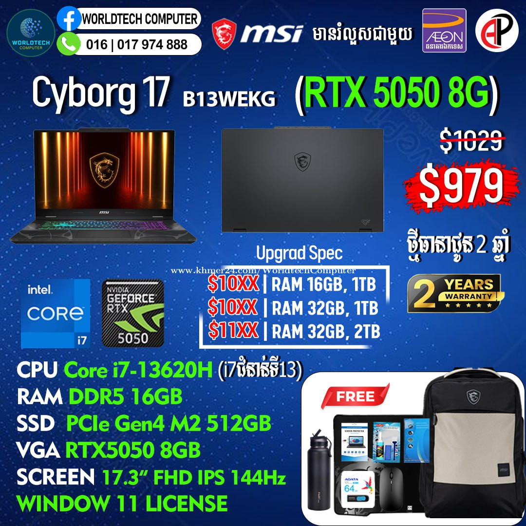 New (Gaming+Design) 2025 ធានា2ឆ្នាំ Warranty 2years from MSI Cambodia Cyborg15 i5-13420HX 8G M2 512GB RTX3050 4G 15.6" 144Hz New=649$ Cyborg15 i7-13620HX 16G M2 512GB RTX3050 4G 15.6" 144Hz New=749$ Cyborg15 i7-13620HX 16G M2 512GB RTX5050 8G 15.6" 144Hz New=899$ Cyborg15 i7-13620HX 16G M2 512GB RTX5060 8G 15.6" 144Hz New=999$ Cyborg17 Cyborg17 i7-13620HX 16G M2 512GB RTX5050 8G 17.3" 144Hz New=979$ Telegram: 017974xxxClick To Call , 011777xxxClick To Call ទីតាំងហាង: ផ្ទះ39Eo ផ្លូវ257 ទឹកល្អក់3 ទួលគោក ភ្នំពេញ (ខាងលិចស្តុបទេពផនប្រហែល 300ម)។ Location: #39E0 St257, Tuol Kouk , Tuek L'ak Bei , Phnom Penh