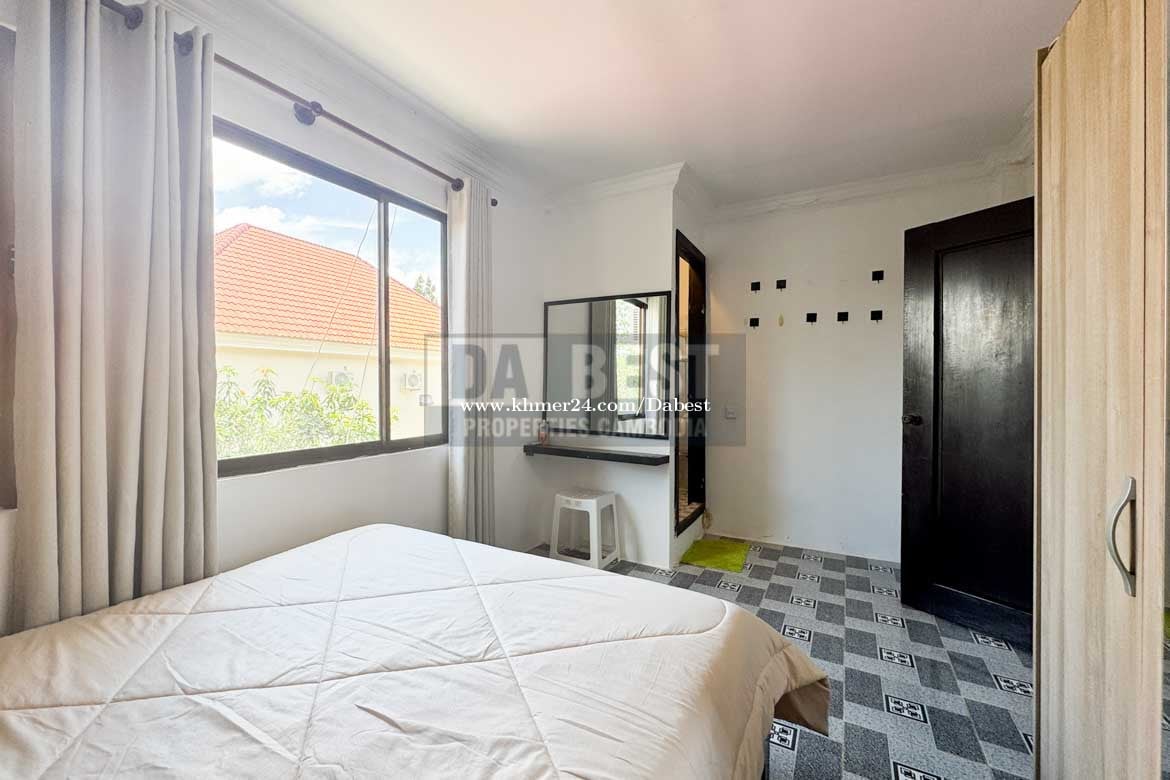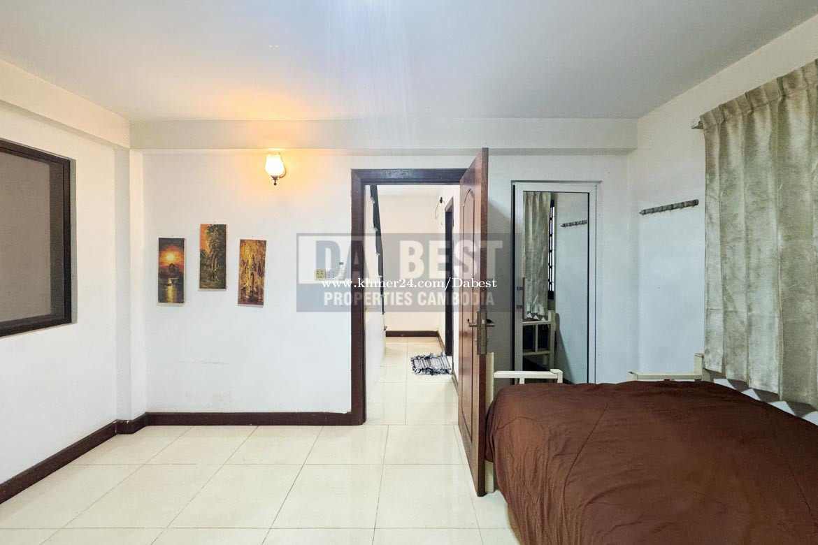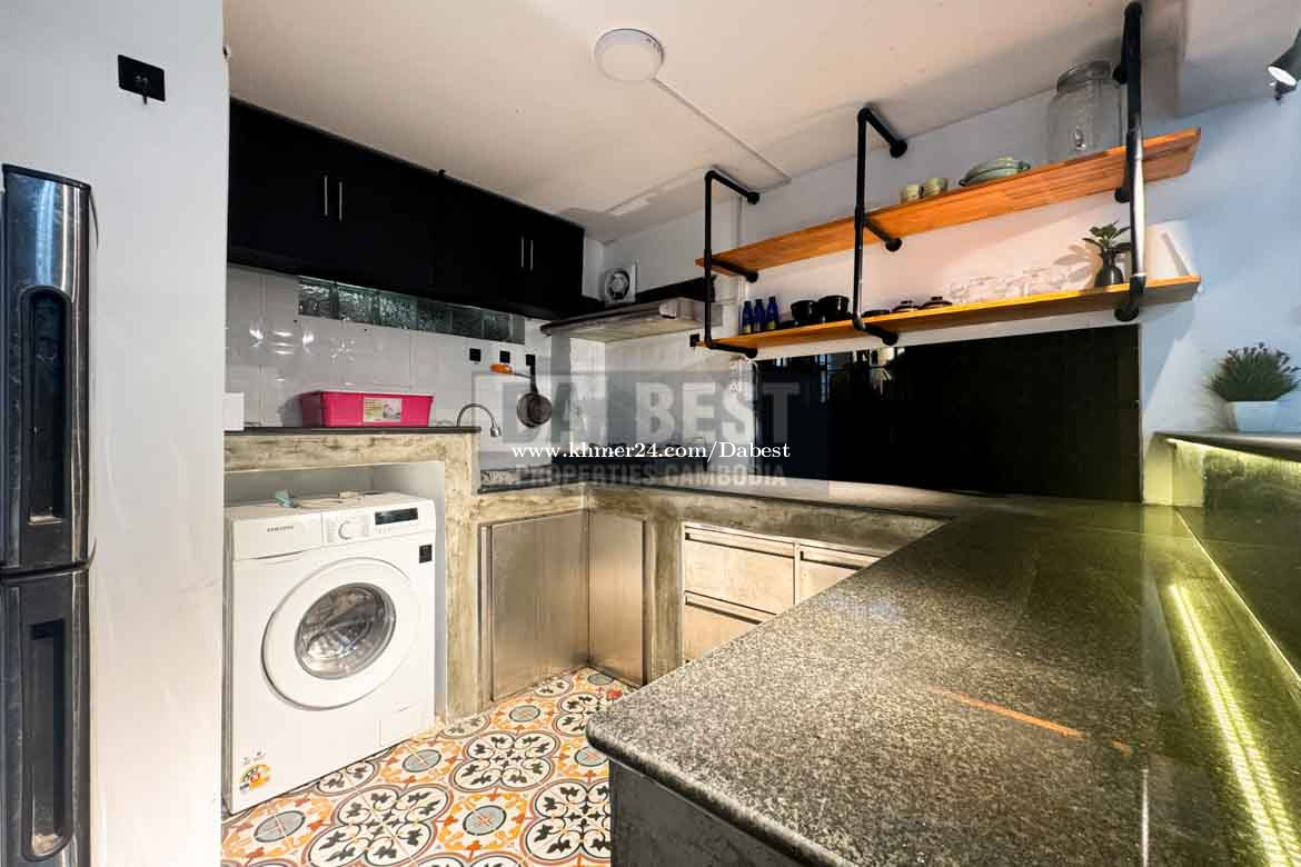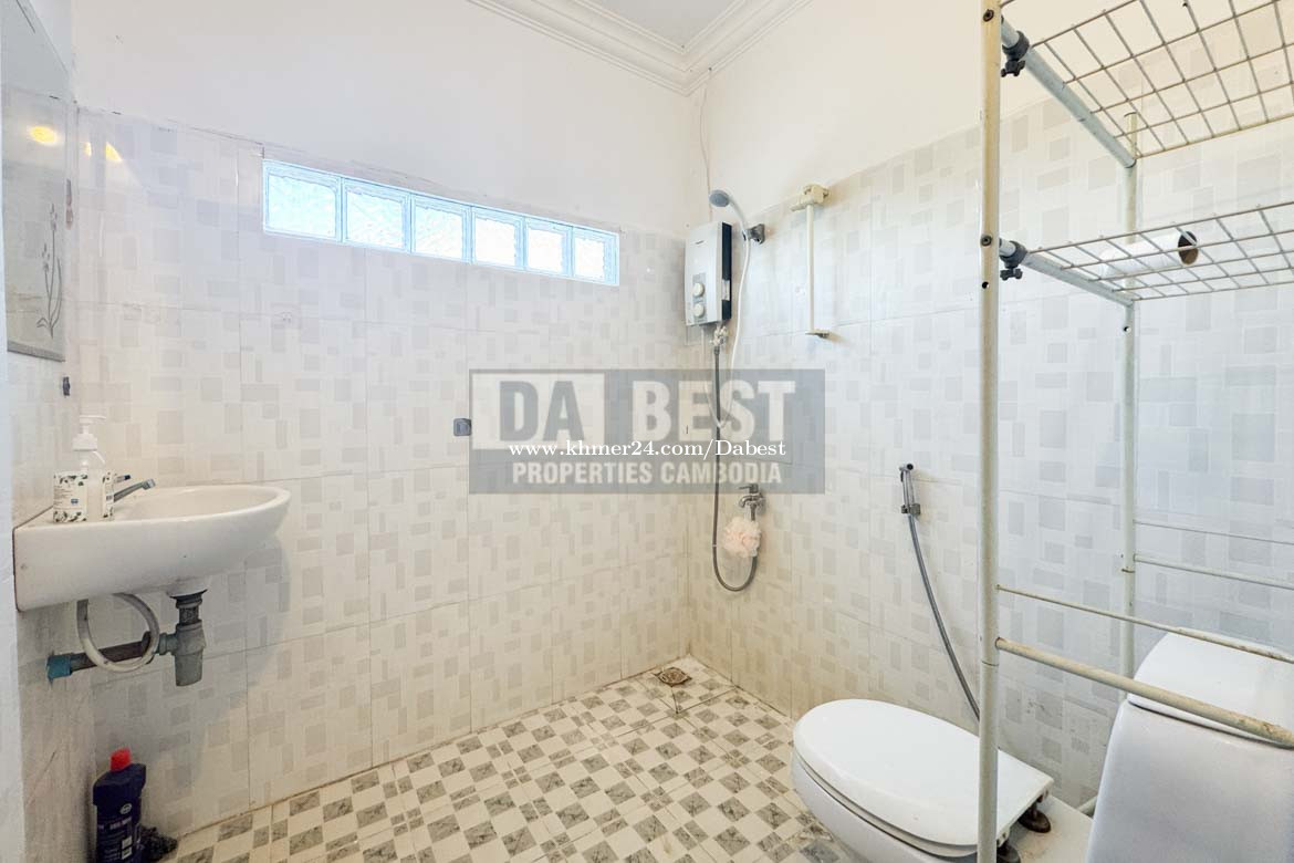• Code: SRV119 • 3 Bedrooms • 4 Bathrooms with hot shower • Living area with Television and Sofa • Fully furnished • Kitchen, Washing machine, fridge, gas cooker • Parking and secured gate • Located in Sangkat Sla Kram
