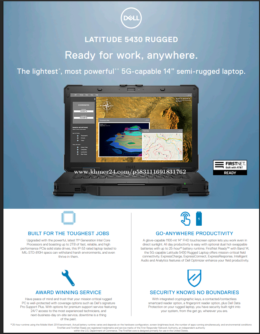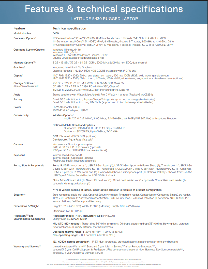 Latitude 5000 Rugged Laptop Most powerful 14 semi-rugged laptop with enhanced battery life and Intel Core i5 processors, so you can work wherever the job demands. 14" Non-touch 400 nits WVA FHD (1920 x 1080) 100% sRGB Anti-Glare Display 11th Gen Intel Core i5-1145G7, vPro (8 MB, 4 cores, 8 threads, 2.60 to 4.00 GHz, Turbo, 28W) Processor Intel Iris Xe Graphics 256 GB, M.2, PCIe NVMe, Solid State Drive 32 GB, 2 x 16 GB, DDR4, 3200 MHz Memory Ports and Slots 1. Smart Card reader | 2. Stylus | 3. Stylus lanyard | 4. microSD Card reader / Nano SIM slot | 5. 2nd TBT4 USB 3.2 Gen 2 Type-C | 6. Choose one: 2nd RS-232 / 2nd RJ-45 / 3rd USB Type-A / Fischer USB 3.0 / Blank | 7. RJ-45 Network port | 8. RS-232 Serial port | 9. HDMI | 10. TBT4 / USB 3.2 Gen 2 Type-C | 11. 2x USB 3.2 Gen 1 Type-A | 12. Universal Audio Jack