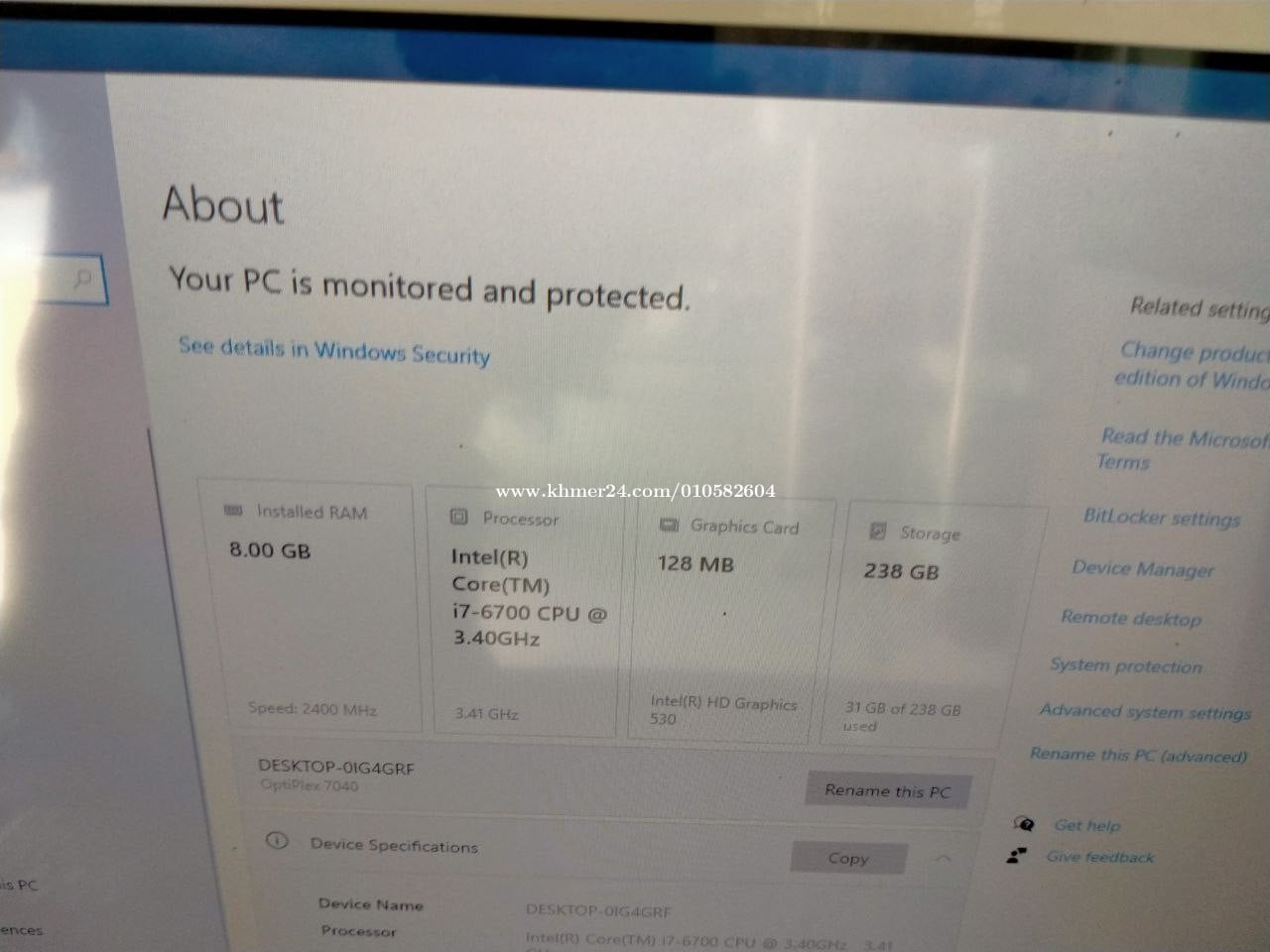 Dell OptiPlex 7040 CPU Corei7-6Gen(8CPUs)@3.4Ghz RAM DDR4 8GB M2 256GB Wireless + Bluetooth Card Original Warranty 1 month
