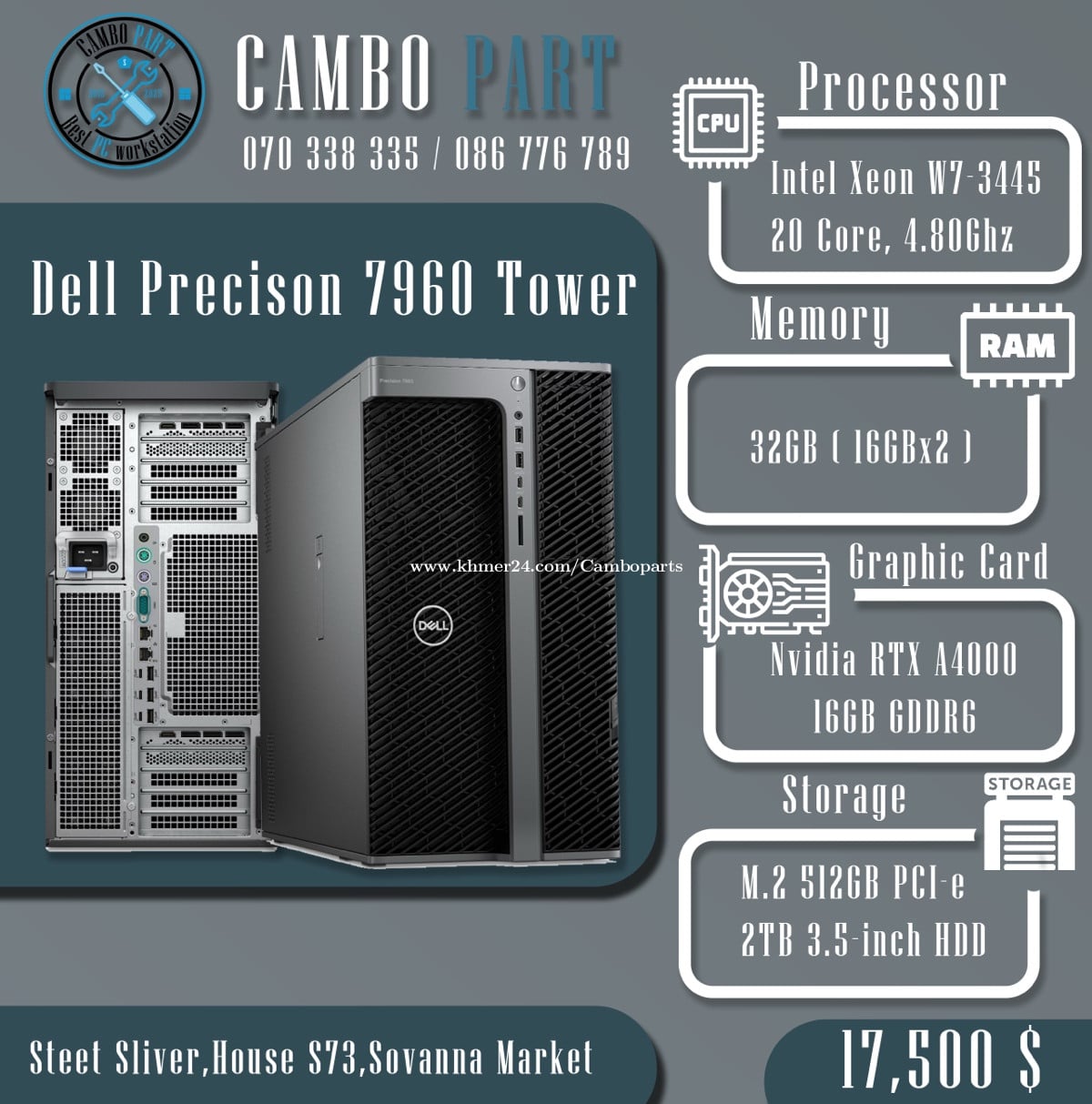 Workstation Dell Precision 7960 Workstation for AI (Artificial intelligence) , VR (Virtual Reality) and AR (Augmented Reality), 4K 8K Editing Rendering Intel Xeon W7-3445 Processor (20Core, Up to 4.80GHz) Ram: Ecc reg PC5 32GB (2X16GB) SSD: 512GB Nvme PCIe M.2 HDD: 2TB 3.5” VGA: NVIDIA RTX A4000 16GB GDDR6 (4DP) Products is new CPU RAM VGA can customize higher Price: 17.500$ Warranty 03 year Mouse Keyboard and Anten Wifi include Telegram: 070338xxxClick To Call