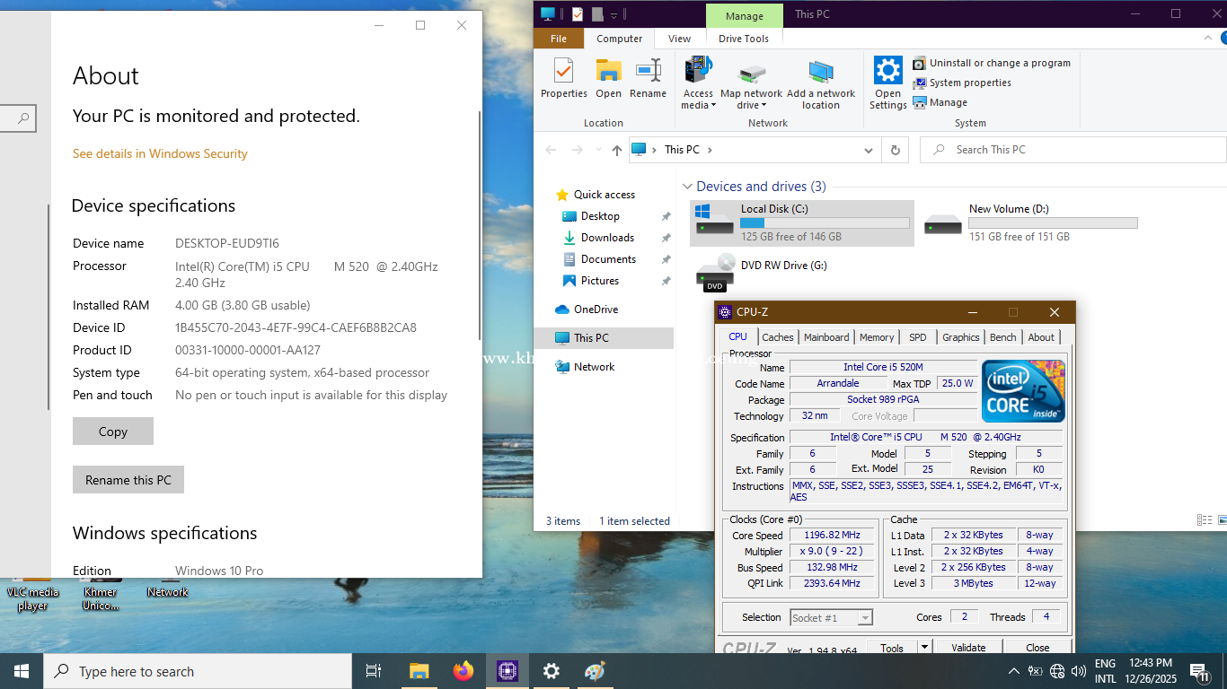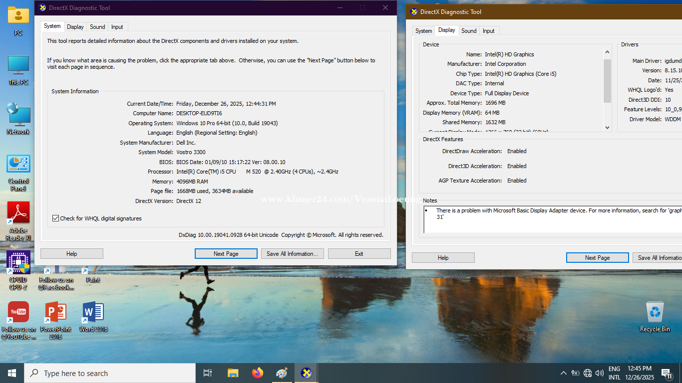 Dell Vostro 3300 CPU Intel(R) Core(TM) i5-520M @ 2.40GHz Ram : 4 GB (DDR3) HDD : 320 GB Sreen : 13.3 Inches Graphic : Intel(R) HD Graphics Battery : មិនមាន Battery ខាងក្រោមទេ Adapter Original, Webcam, Keyboard light នៅស្អាតភ្លឹង ធានាម៉ាស៊ីន 1 សប្តាហ៍ Address : ផ្លូវ 49BT, សង្កាត់បឹងទំពន់ I, ខ័ណ្ឌមានជ័យ, ភ្នំពេញ Street 49BT, Sangkat Beung Tumpun, Khan Mean Chey, Phnom Penh 25$