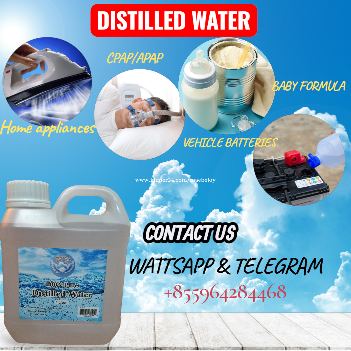 Distilled water is essentially free of contaminants like pesticides and bacteria, which could be especially helpful to those with weakened immune systems. Our distilled water is available to purchase in these locations In Siem Reap. https://maps.app.goo.gl/GnDPzbCKSrUeTtSJ7 https://maps.app.goo.gl/C279t66DkKhwn91o8 https://maps.app.goo.gl/H1eaAJkDkU9FtBS87 Message directly for home and other cities delivery. Telegram and wattsapp:+85596428xxxClick To Call8