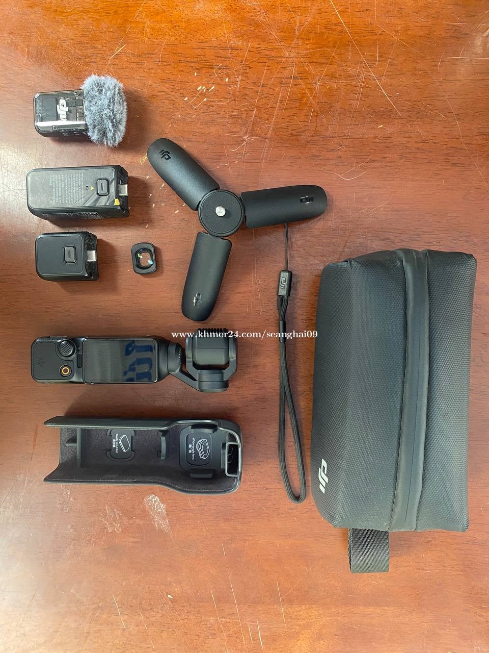 លក់ DJI Osmo Pocket 3 camera (មួយតឹកដូចថ្មី 99%) អត់សូវមានពេលប្រើ USB-C to USB-C PD cable Protective cover/shell Wrist strap Handle with ¼″-20 thread Wide-angle lens attachment DJI Mic 2 transmitter Battery handle Mini tripod Carrying bag
