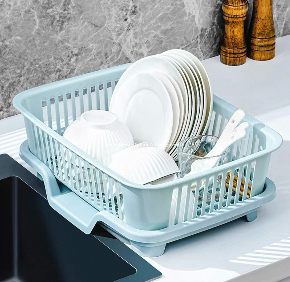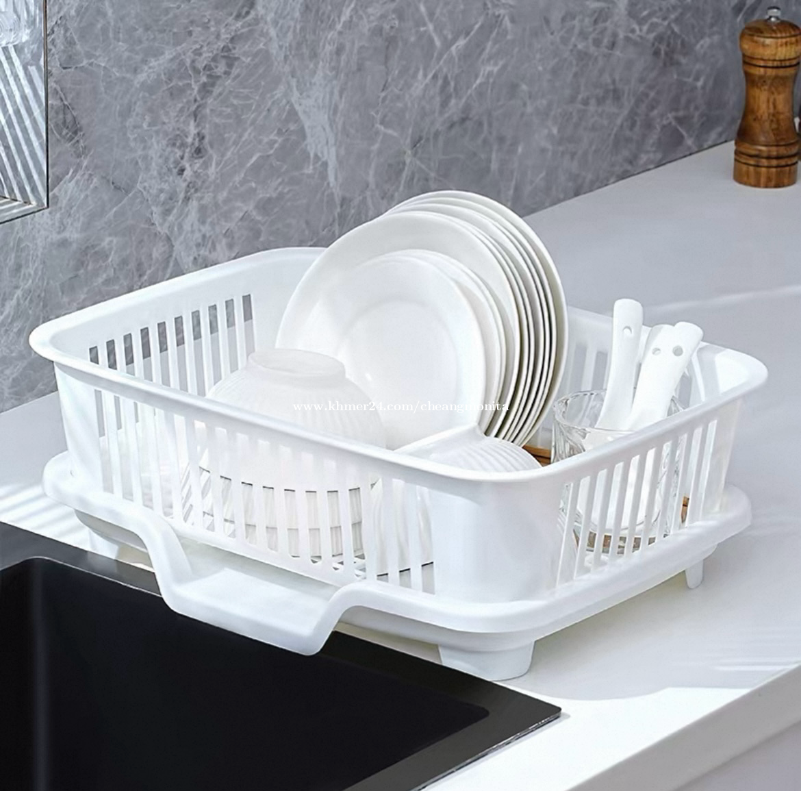 This practical dish drying rack is designed to keep your kitchen countertop clean and organized. Made from durable, lightweight plastic, it features an open slotted design that allows water to drain efficiently into the removable drip tray below. The rack provides ample space for plates, bowls, cups, and utensils, keeping them upright for faster air-drying. Its compact size fits neatly beside the sink, making it ideal for everyday use in modern kitchens.