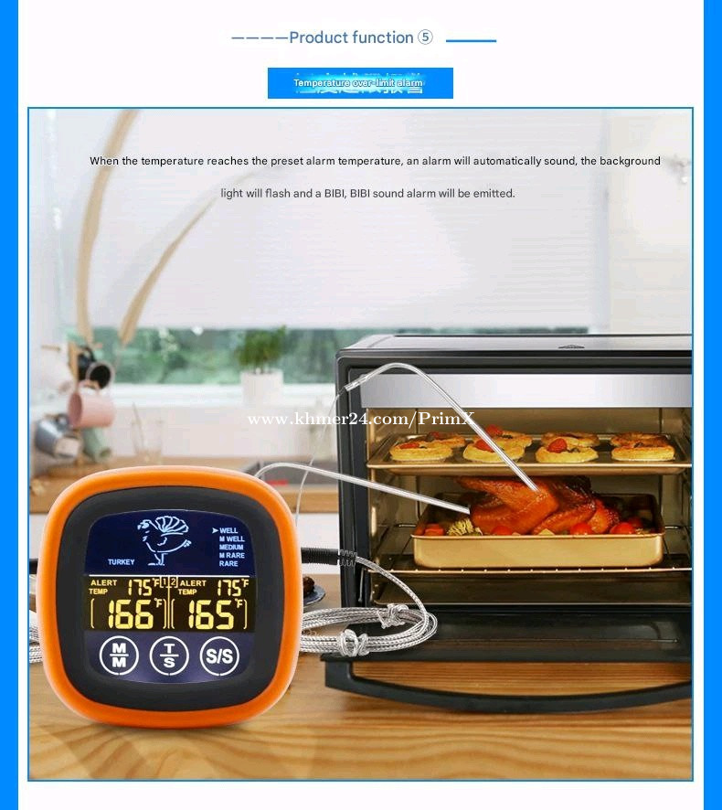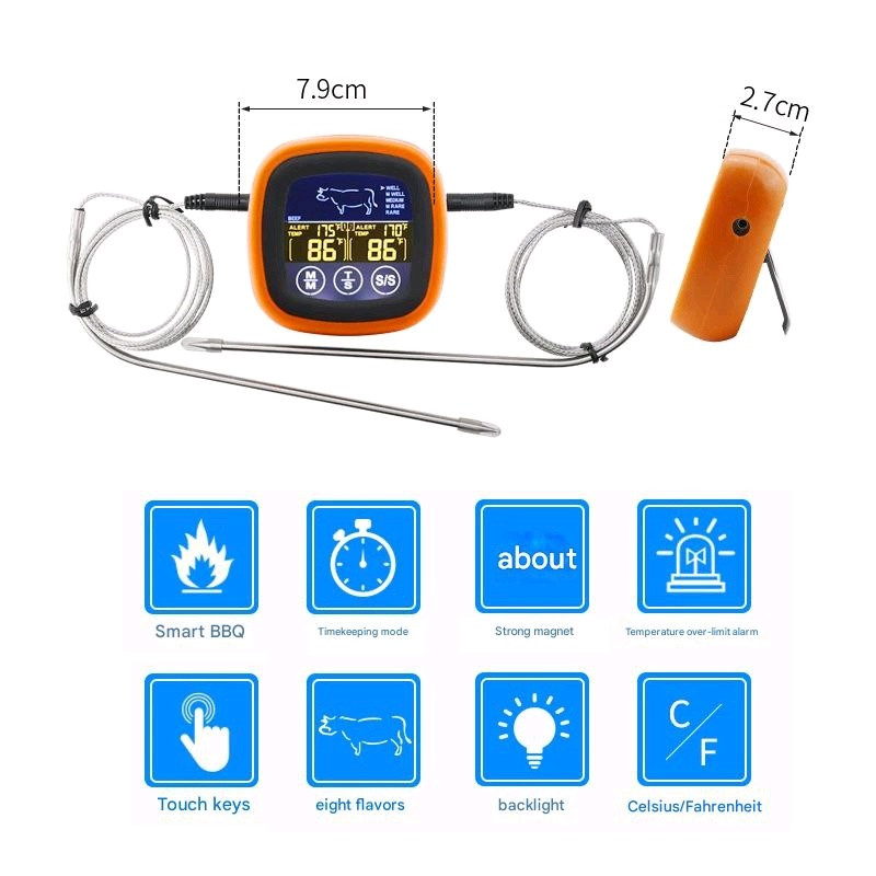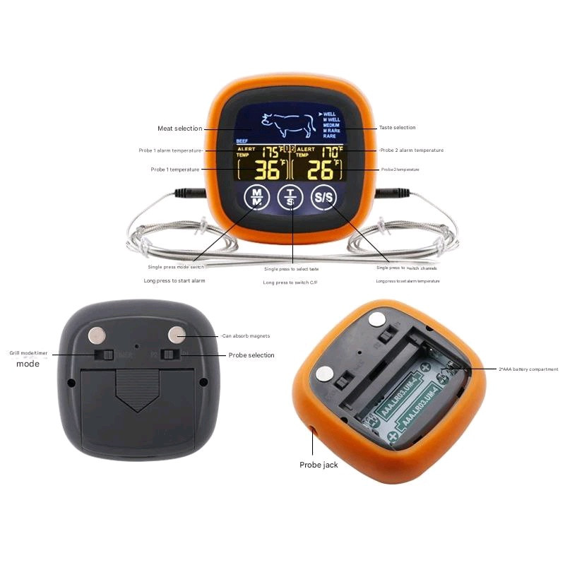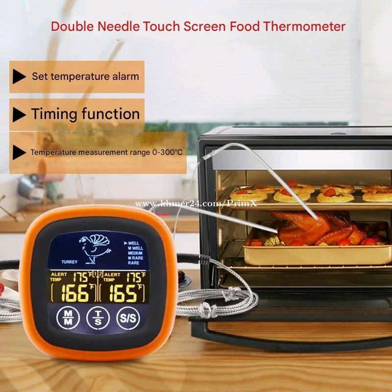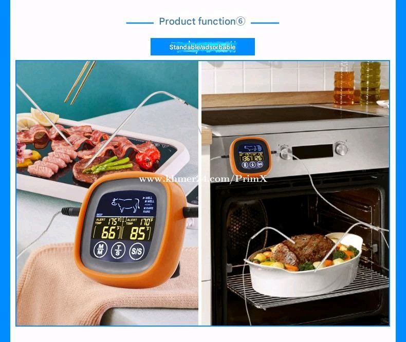 Dual Probe Oven Grill Food Thermometer with Touch Screen (2 probes) Specifications: Product Model: XHX-6602 Product Color: Orange Black Product Weight: 130 g Package Weight: 160 g Product Size: 7.5*2.5*7.5 cm Temperature Range: -20 ~ 250 ℃ (-4° ~ 482° F) $14.00 / unit Products are in Phnom Penh Telegram @PrimX_PP