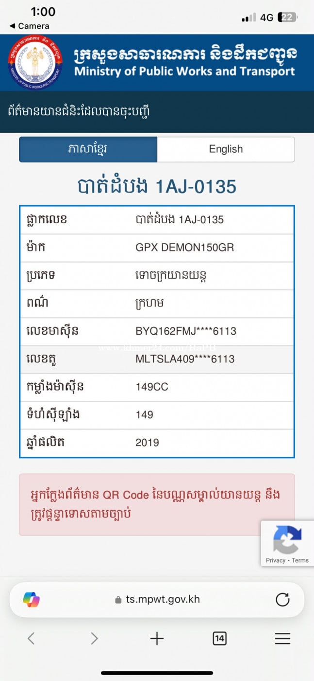 GPX DEMON 150 GR 99% 2019 150cc ដៃម្ចាស់តែមួយហេីយអត់សូវបានជិះទេ ធានាថាថ្មីខ្លាំង❤️ មានពន្ធត្រឹមត្រូវ មកមេីលបាននៅបាត់ដំបង Phone Number 087611xxxClick To Call telegram @Ra_PB