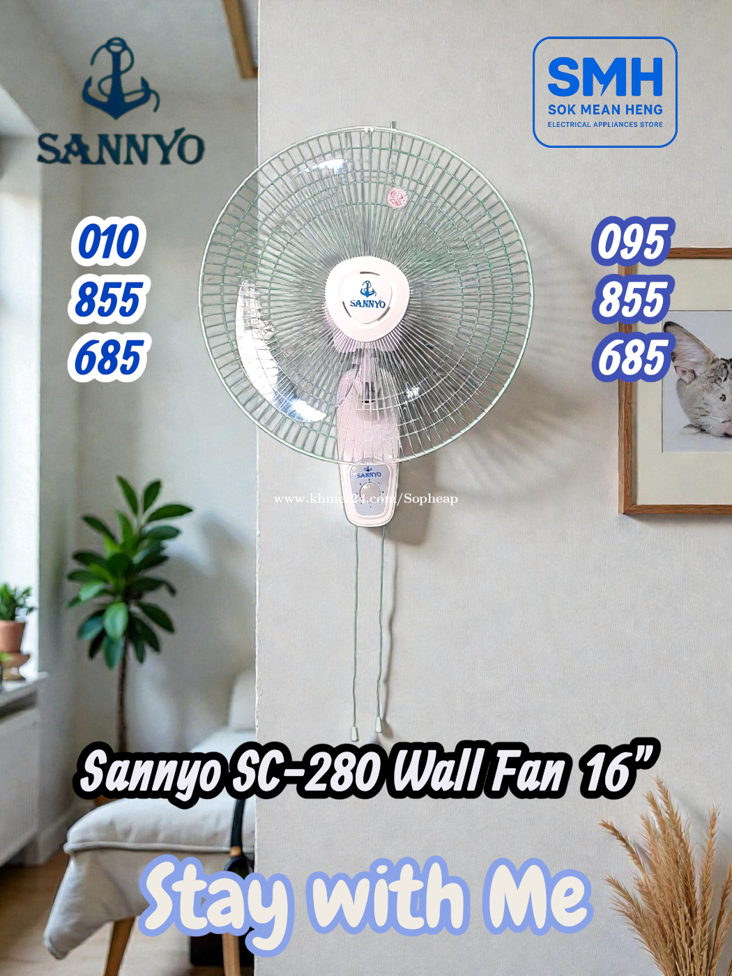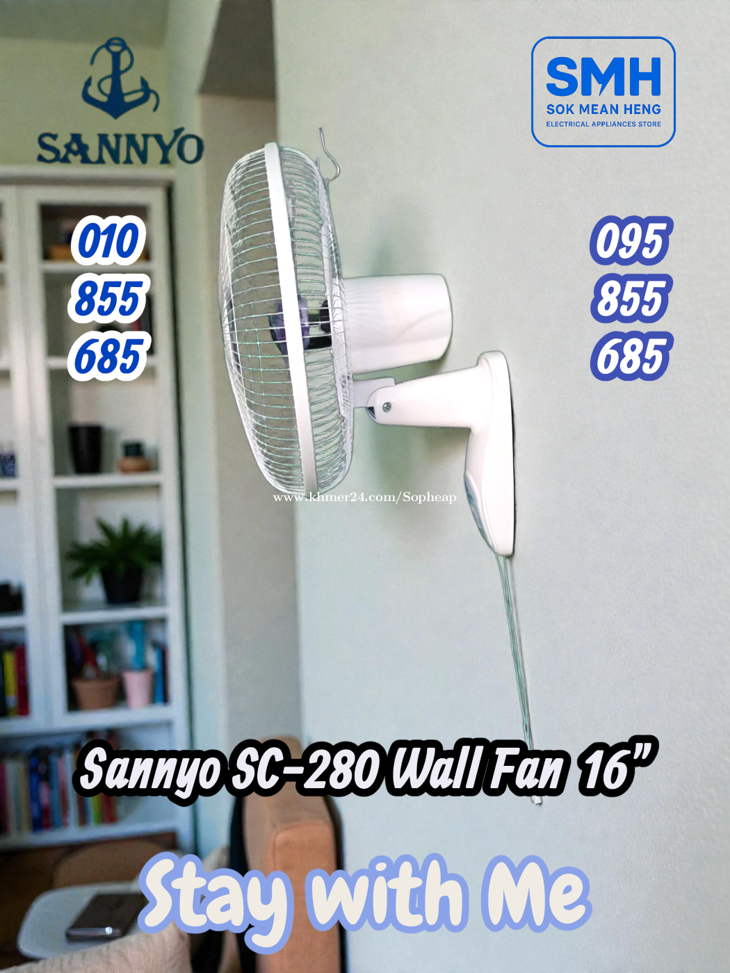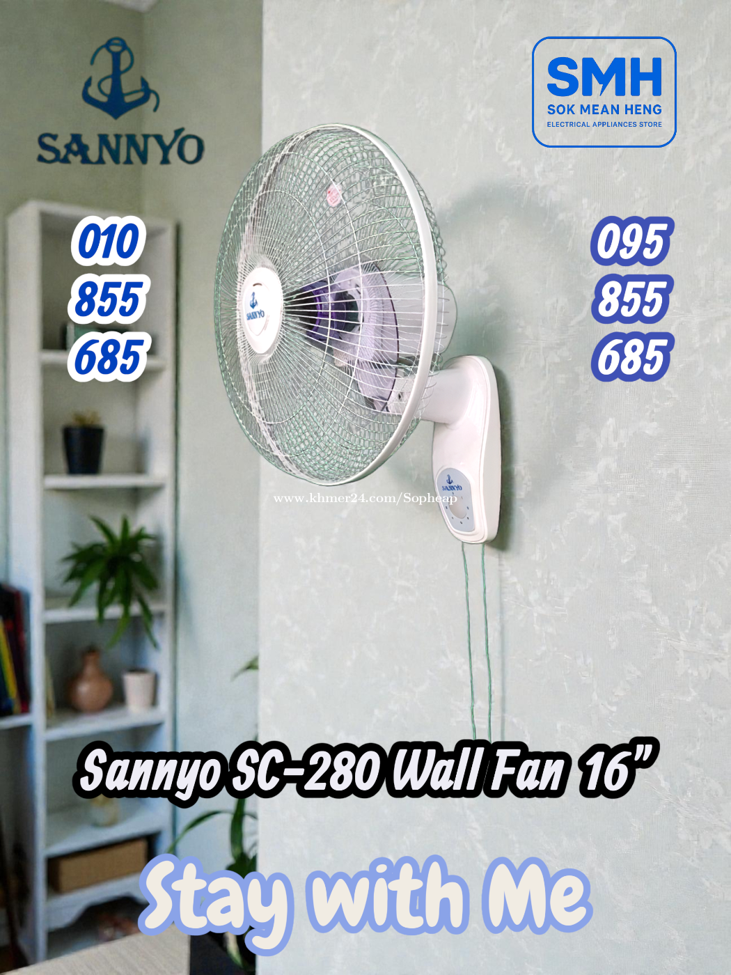 កង្ហារជញ្ជាំង_ខ្សែ2 Sannyo SC-280 Wall Fan _ 16" (New) . - Size: 16" / 40cm - Power: 42W / 220V-50Hz - Color: White * Noted: ខ្សែ2 ប្រើម៉ូទ័ររ៉េ . * តំលៃ / Price: 18$ . SMH / សុខ មាន ហេង / Sok Mean Heng ហាងលក់គ្រឿងប្រើប្រាស់អគ្គិសនី / Electrical Appliances Store . Phone Number: Smart: 010855xxxClick To Call (Call Only) . Phone Number / Telegram (សេវាកម្មរហ័ស / Fast Service): Cellcard: 095855xxxClick To Call / http://t.me/Annsopheap095 . អាស័យដ្ឋាន / Address: No. 392, MaoTseToung Blvd. (St. 245), Phnom Penh. (Near P Jolie Beauty Center) . ផែនទី / Maps: https://www.google.com/maps?q=11.55595844757693,104.90165490657091&15 . #SMH #កង្ហារ #Fan #Sannyo