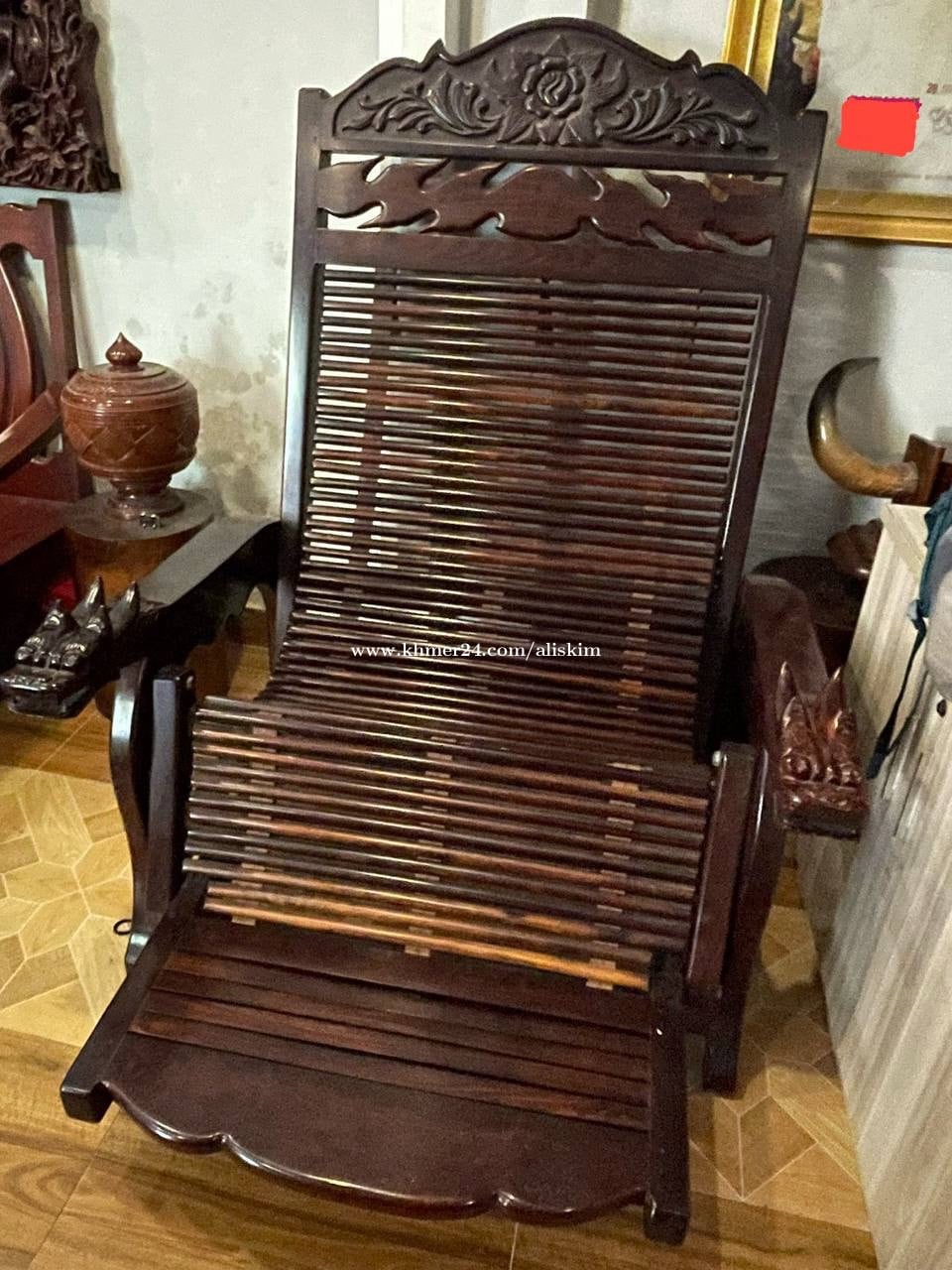 កំពស់ 1.39m x ទទឹង 1.00m កៅអីហង្សទេរ ធ្វើពីឈើគ្រញូងខ្មែរ ក្បាច់នាគនៅដៃ (ទឹកដៃប្រណិត) តំលៃ799$ (ចចារបាន)