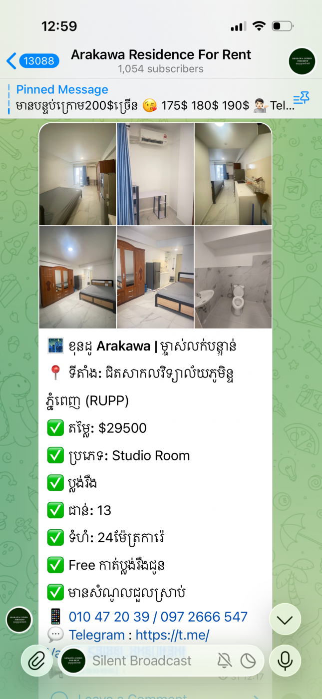 🌃 ខុនដូ Arakawa | ម្ចាស់លក់បន្ទាន់ 📍 ទីតាំង: ជិតសាកលវិទ្យាល័យភូមិន្ទភ្នំពេញ (RUPP) ✅ តម្លៃ: $29500 ✅ ប្រភេទ: Studio Room ✅ ប្លង់រឹង ✅ ជាន់: 13 ✅ ទំហំ: 24ម៉ែត្រការ៉េ ✅ Free កាត់ប្លង់រឹងជូន ✅ មានសំណូលជួលស្រាប់ 📱 010472xxxClick To Call / 0972666xxxClick To Call 💬 Telegram : https://t.me/Vatey_SalesConsultant