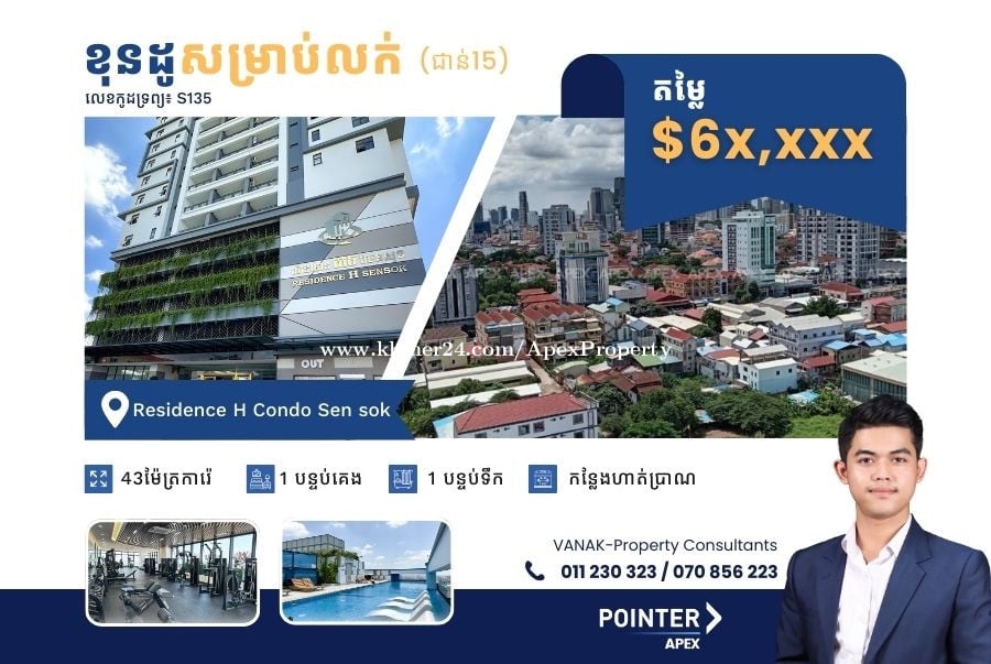 [លក់ប្រញាប់! ខុនដូ 1បន្ទប់គេងម្ចាស់លក់ $6x,xxx] ___________ - ខុនដូតម្លៃពេញជាង 6 ម៉ឺនដុល្លារ (ចចារជាក់ស្តែង) - ជាន់ទី 15 - ទិសបែរទៅជើង - ទំហំ 43 ម៉ែត្រការ៉េ - 1 បន្ទប់គេង 1 បន្ទប់ទឹក - ខុនដូមានសម្ភារៈស្រាប់ ✅ លក្ខខណ្ឌចចារ - បង់ផ្តាច់ 📍ទីតាំង៖ Residence H Condo Sen Sok 🔎ស្វែងរកអចលនទ្រព្យតាមតម្រូវការអ្នក! 🏢🏡 លេខកូដអចលនទ្រព្យ: S134 ☎️ 011230xxxClick To Call / 070856xxxClick To Call 📲 Telegram: https://t.me/vanak25 📲Channel Telegram: https://t.me/Vanak_pov Discover your perfect property match with me!