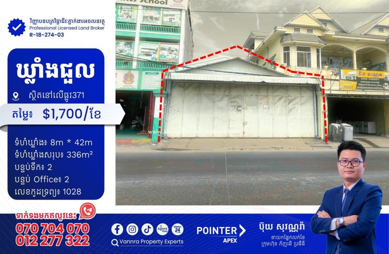 ឃ្លាំងជួលនៅលើផ្លូវ371 ជិតផ្សារប៉េសេ សម្រាប់ជួល $1,700/ខែ ទំហំឃ្លាំង: 8m x 42m ទំហំឃ្លាំងសរុប: 336m² បន្ទប់Office: 2 បន្ទប់ទឹក: 2 🔐លេខកូដអចលនវត្ថុ៖ 1028 ស្ថិតនៅលើផ្លូវ371 ជិតផ្សារប៉េសេ សង្កាត់បឹងទំពុន2 ខណ្ឌមានជ័យ ភ្នំពេញ ——————————— ទាក់ទងមកឥលូវនេះ៖ Call: 070704xxxClick To Call / 012277xxxClick To Call Telegram: https://t.me/vannraaa 微信号: vannra-experts - Channel: https://t.me/vannrapropertyexperts - Tiktok: https://www.tiktok.com/@vannra_property_experts - Facebook: https://www.facebook.com/vannra.phnompenh.property/