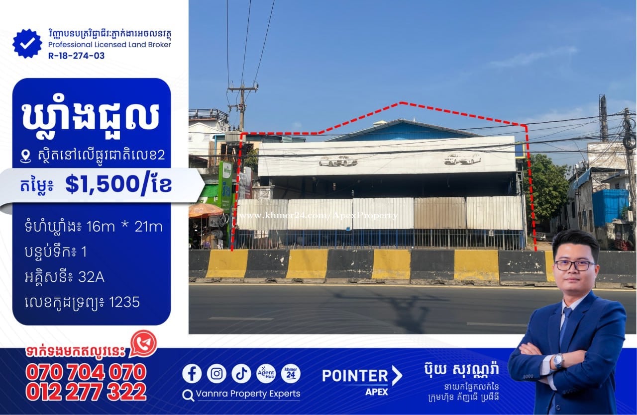 ឃ្លាំងជួលនៅលើផ្លូវជាតិលេខ2 សម្រាប់ជួល: $1,500/ខែ ទំហំឃ្លាំង:16m x 21m បន្ទប់ទឹក:1 អគ្គិសនី: 32A 🔐លេខកូដអចលនវត្ថុ៖ 1235 ស្ថិតនៅលើផ្លូវជាតិលេខ2 សង្កាត់ចាក់អង្រែក្រោម ខណ្ឌមានជ័យ ភ្នំពេញ ——————————— ទាក់ទងមកឥលូវនេះ៖ Call: 070704xxxClick To Call / 012277xxxClick To Call Telegram: https://t.me/vannraaa 微信号: vannra-experts - Channel: https://t.me/vannrapropertyexperts - Tiktok: https://www.tiktok.com/@vannra_property_experts - Facebook: https://www.facebook.com/vannra.phnompenh.property/