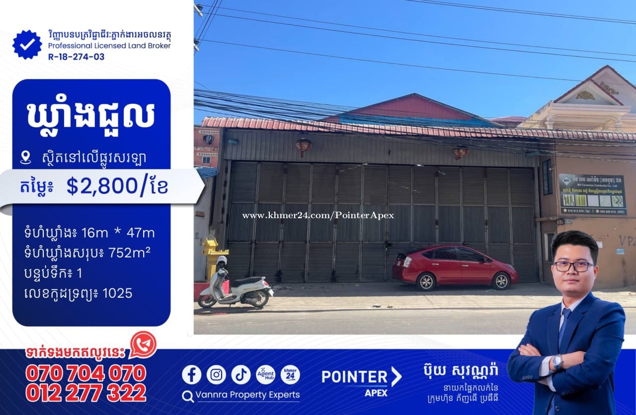 ឃ្លាំងជួលនៅលើផ្លូវសរឡា សម្រាប់ជួល: $2,800/ខែ ទំហំឃ្លាំង: 16m x 47m ទំហំឃ្លាំងសរុប: 752m² 🔐លេខកូដអចលនវត្ថុ៖ 1025 ស្ថិតនៅលើផ្លូវសរឡា សង្កាត់ស្ទឹងមានជ័យ3 ខណ្ឌមានជ័យភ្នំពេញ ——————————— ទាក់ទងមកឥលូវនេះ៖ Call: 070704xxxClick To Call / 012277xxxClick To Call Telegram: https://t.me/vannraaa 微信号: vannra-experts - Channel: https://t.me/vannrapropertyexperts - Tiktok: https://www.tiktok.com/@vannra_property_experts - Facebook: https://www.facebook.com/vannra.phnompenh.property/