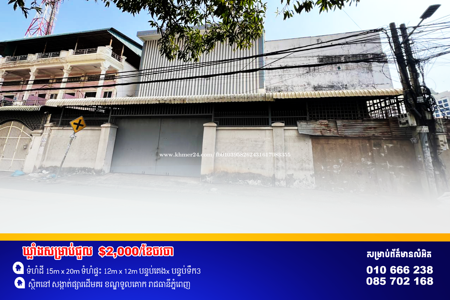 ឃ្លាំងសម្រាប់ជួល ស្ថិតនៅជិតផ្សារដើមគរ ល្អសម្រាប់ដាក់ឥវ៉ាន់ នឹងធ្វើជាឃ្លាំងឡានបាន 📍ទីតាំងស្ថិននៅ សង្កាត់ផ្សារដើមគរ ខណ្ឌទួលគោក ភ្នំពេញ ************************** តម្លៃជួលRent Price $2,000/month ◈━━━━━━━━━━━━◈ កុងត្រាជួលចាប់ពី1-3ឆ្នាំ កក់2ខែបង់1ខែ Contract : 1-3Years Deposit2 Payment 1 ◈━━━━━━━━━━━━◈ 📍សូមចូលទៅកាន់𝗧𝗲𝗹𝗲𝗴𝗿𝗮𝗺 𝗖𝗵𝗮𝗻𝗻𝗲𝗹ពេលនេះ ដើម្បីស្វែងរកអចលនទ្រព្យពិសេសផ្សេងទៀត៖ 🔗 𝐓𝐞𝐥𝐞. 𝐂𝐡𝐚𝐧𝐧𝐞𝐥:𝗵𝘁𝘁𝗽𝘀://𝘁.𝗺𝗲/𝗦𝗼𝗸𝗵𝗮𝗶𝗥𝗲𝗮𝗹𝘁𝘆 ☎️ 𝗧𝗲𝗹𝗲𝗴𝗿𝗮𝗺:𝟬𝟭𝟬 𝟲𝟲𝟲 𝟮𝟯𝟴 ☎️ 𝗧𝗲𝗹𝗲𝗴𝗿𝗮𝗺:𝟬𝟴𝟱 𝟳𝟬𝟮 𝟭𝟲𝟴