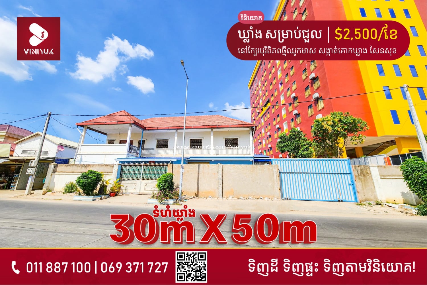 🏡ឃ្លាំង សម្រាប់ជួល !! 📍ទីតាំង ៖ នៅក្បែរបុរីពិភពថ្មីឈូកមាស សង្កាត់គោកឃ្លាង ខណ្ឌសែនសុខ - តម្លៃជួល : $2,500/ខែ ចរចា - ទំហំឃ្លាំង : 30m x 50m - សម្ភារៈ ម៉ាស៊ីនត្រជាក់ 1 - លេខអាជ្ញាប័ណ្ណ : E-22-404