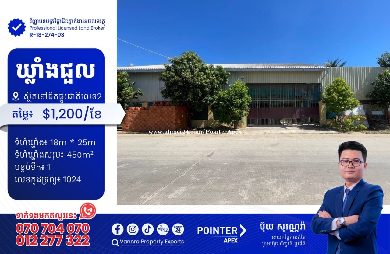 ឃ្លាំងជួលនៅជិតផ្លូវជាតិលេខ2 សម្រាប់ជួល: $1,200/ខែ ទំហំឃ្លាំង: 18m x 25m ទំហំឃ្លាំងសរុប: 450m² 🔐លេខកូដអចលនវត្ថុ៖ 1024 ស្ថិតនៅលើផ្លូវបេតុង សង្កាត់ព្រែកហូរ ក្រុងតាខ្មៅ កណ្តាល ——————————— ទាក់ទងមកឥលូវនេះ៖ Call: 070704xxxClick To Call / 012277xxxClick To Call Telegram: https://t.me/vannraaa 微信号: vannra-experts - Channel: https://t.me/vannrapropertyexperts - Tiktok: https://www.tiktok.com/@vannra_property_experts - Facebook: https://www.facebook.com/vannra.phnompenh.property/