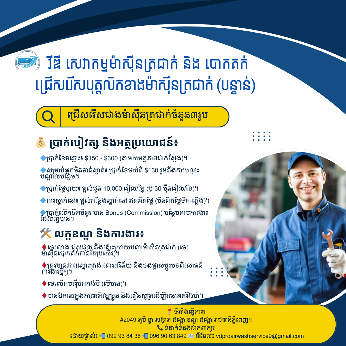 📢 ប្រកាសរើសបុគ្គលិកផ្នែកជាងម៉ាស៊ីនត្រជាក់ (បន្ទាន់) Vd Pro Air Wash Service ត្រូវការរើសបុគ្គលិកផ្នែកជាង (Technician) 3 រូប៖ 💰 ប្រាក់បៀវត្ស និងអត្ថប្រយោជន៍៖ 🔷ប្រាក់ខែចន្លោះ៖ $150 - $300 (តាមសមត្ថភាពជាក់ស្តែង)។ 🔷សម្រាប់អ្នកមិនទាន់ស្ទាត់៖ ប្រាក់ខែចាប់ពី $130 រួមនឹងការបណ្តុះបណ្តាលបន្ថែម។ 🔷ប្រាក់ថ្លៃបាយ៖ ផ្តល់ជូន 10,000 រៀល/ថ្ងៃ (ឬ 30 ម៉ឺនរៀល/ខែ)។ 🔷ការស្នាក់នៅ៖ ផ្តល់កន្លែងស្នាក់នៅ ឥតគិតថ្លៃ (មិនគិតថ្លៃទឹក-ភ្លើង)។ 🔷ប្រាក់លើកទឹកចិត្ត៖ មាន Bonus (Commission) បន្ថែមតាមការងារដែលធ្វើបាន។ 🛠 លក្ខខណ្ឌ និងការងារ៖ ♦️ចេះលាង ជួសជុល និងដោះស្រាយបញ្ហាម៉ាស៊ីនត្រជាក់ (ចេះម៉ាស៊ីនបោកគក់កាន់តែប្រសើរ)។ ♦️ត្រូវមានភាពស្មោះត្រង់ គោរពវិន័យ និងចង់ផ្លាស់ប្តូរបទពិសោធន៍ការងារថ្មីៗ។ ♦️ចេះបើកបររ៉ឺម៉កកង់បី (បើមាន)។ ♦️មានឱកាសក្នុងការអភិវឌ្ឍខ្លួន និងរៀនសូត្រដើម្បីអនាគតរឹងមាំ។ 📍 ទីតាំងធ្វើការ៖ #2049 ភូមិ ខ្វា សង្កាត់ ដង្កោ ខណ្ឌ ដង្កោ រាជធានីភ្នំពេញ។ 📞 ទំនាក់ទំនងដាក់ពាក្យ៖ ទាក់ទងលោក Hon Chandevit ដោយផ្ទាល់៖ 📲 092938xxxClick To Call 📲 0969063xxxClick To Call 📧 អ៊ីមែល៖ vdp*****************@gmail.comClick To Sent Email